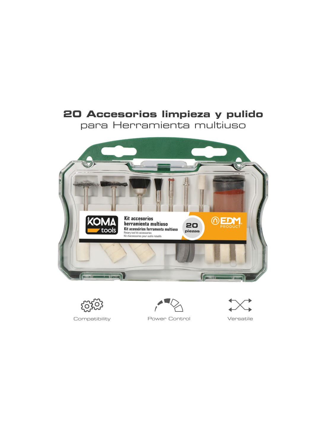 Set 20 accesorios para mini herramienta multiusos 08709. mandril 1pc para rueda de corte: ø3.2 mm. mandril 1pc para rueda de fieltro: cepillo 4pcs: ø3.2 mm. ruedas de fieltro 3pcs: 25x6.3 mm. ruedas de fieltro 6pcs: 12.7x6.3 mm. 2pcs rueda de esmeril de goma: 22x3 mm. compuesto de pulido 1pc. 1pc rueda de fieltro puntiaguda. rueda de pulido 1pc: ø3.2 mm. medida de la caja: 17x3,8x12,5cm