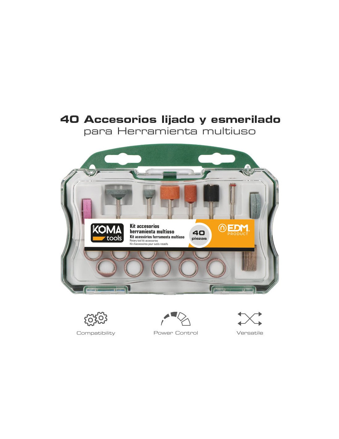 Set 40 accesorios para mini herramienta multiusos 08709. 40 piezas de lijado y esmerilado: muela de 4 piezas con vástago: ø3.2 mm banda de lijar 10pcs: 12.7x12.7 mm. vástago de lijado 1pc: ø3,2 mm. mandril 1pc para discos: ø3,2 mm. 4pcs muelas: 20 x 3,2 mm. papel de lija 20 pcs. medida caja: 17 x 3,8 x 12 cm