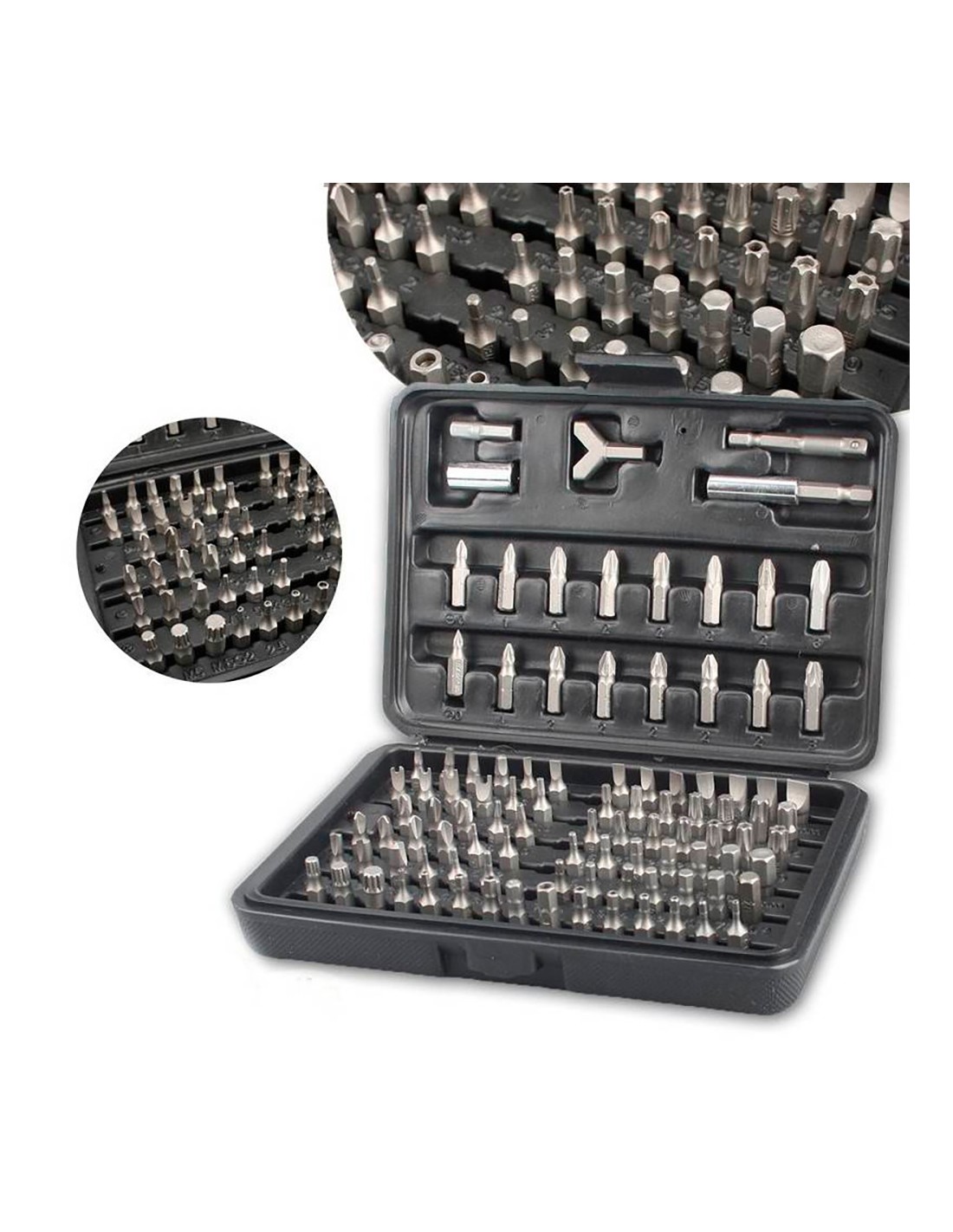 Kit 100 unid. puntas de destornillador. con maletín: adaptador de 1 bit, 1 destornillador de gancho, 1 soporte de imán, 12 brocas hexagonales con diámetro interior 2/2.5/3/4/5/6mm - 5/64-3/32-7/64-1/ 8-9/64-5/32, 19 brocas hexagonales 1.5/2/2.5/3/4/5/5.5/6/8mm - 1/16-5/64-3/32-7/64-1/8-9/64-5/ 32-3/16-7/32-1/4, 2 adaptadores 25/50mm, 3 brocas de sujeción gr.1/2/3, 3 brocas de dientes multiples m5/m6/m8, 4 brocas para tornillos torq-set gr.8/06/10, 4 bits para tornillos tri-wing gr.1/2/3/4, 4 brocas para tornillos de seguridad gr.4/6/8/10mm, 4 bits cuadrados gr.0/1/2/3, 8 brocas de ph con cabeza cruzada gr.0/1/2/3, 8 brocas pz de cruceta gr.0/1/2/3, 9 brocas de perfil en t t8/t10/t15/t20/t25/t27/t30/t40/t45 y 9 brocas de ranura 3/4-4.5-5- 5.5-6-6.5-7/8mm.