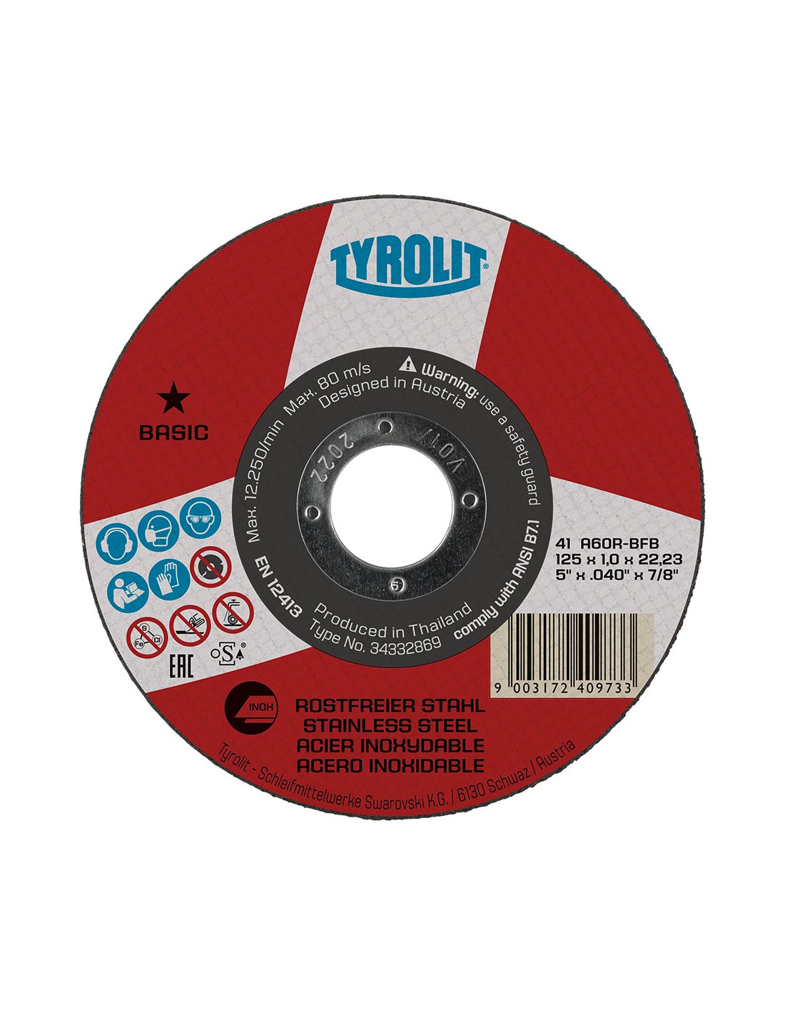 ➜ Plano central de 125 mm (5") x 1,0 mm (3/64") x 22,2 mm (7/8")➜ Disco de corte para metal e inoxidable.➜ Presentación en etiqueta