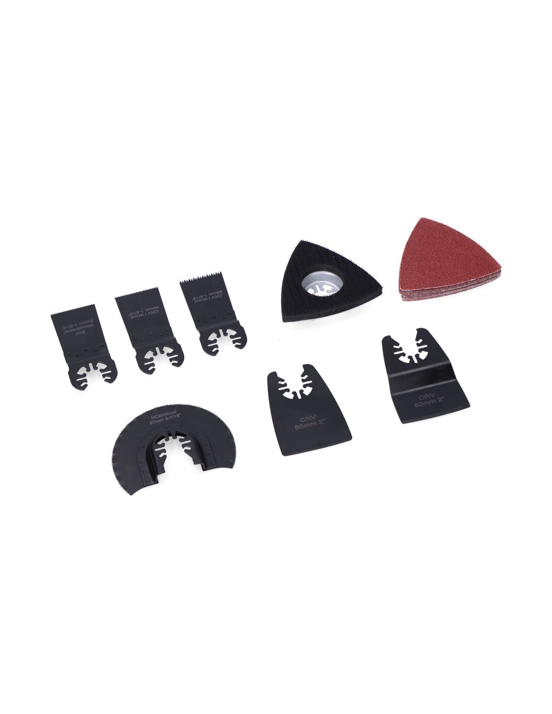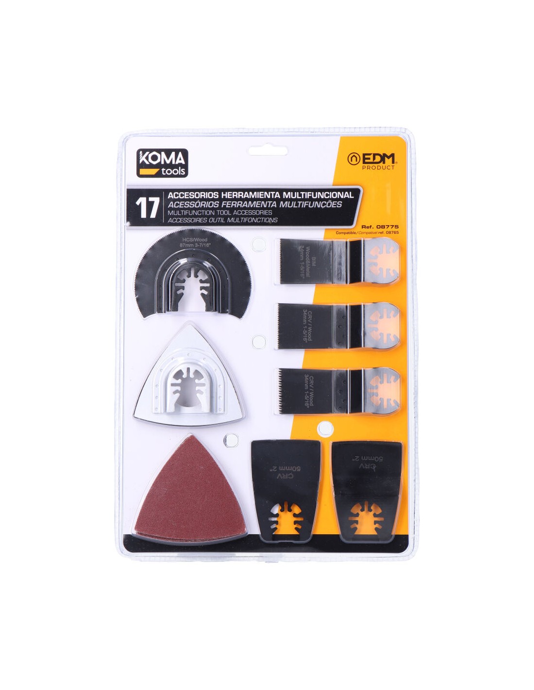 Kit 17 accesorios para herramienta multifuncional 08765 incluye: 1 sierra radial + 2 sierras para madera + 1 sierra para metal + 1 rascador rígido + 1 rascador flexible + 1 soporte lijadora delta 80mm + 10 papel de lija 80mm (4xp60 + 3xp80 + 3xp120)