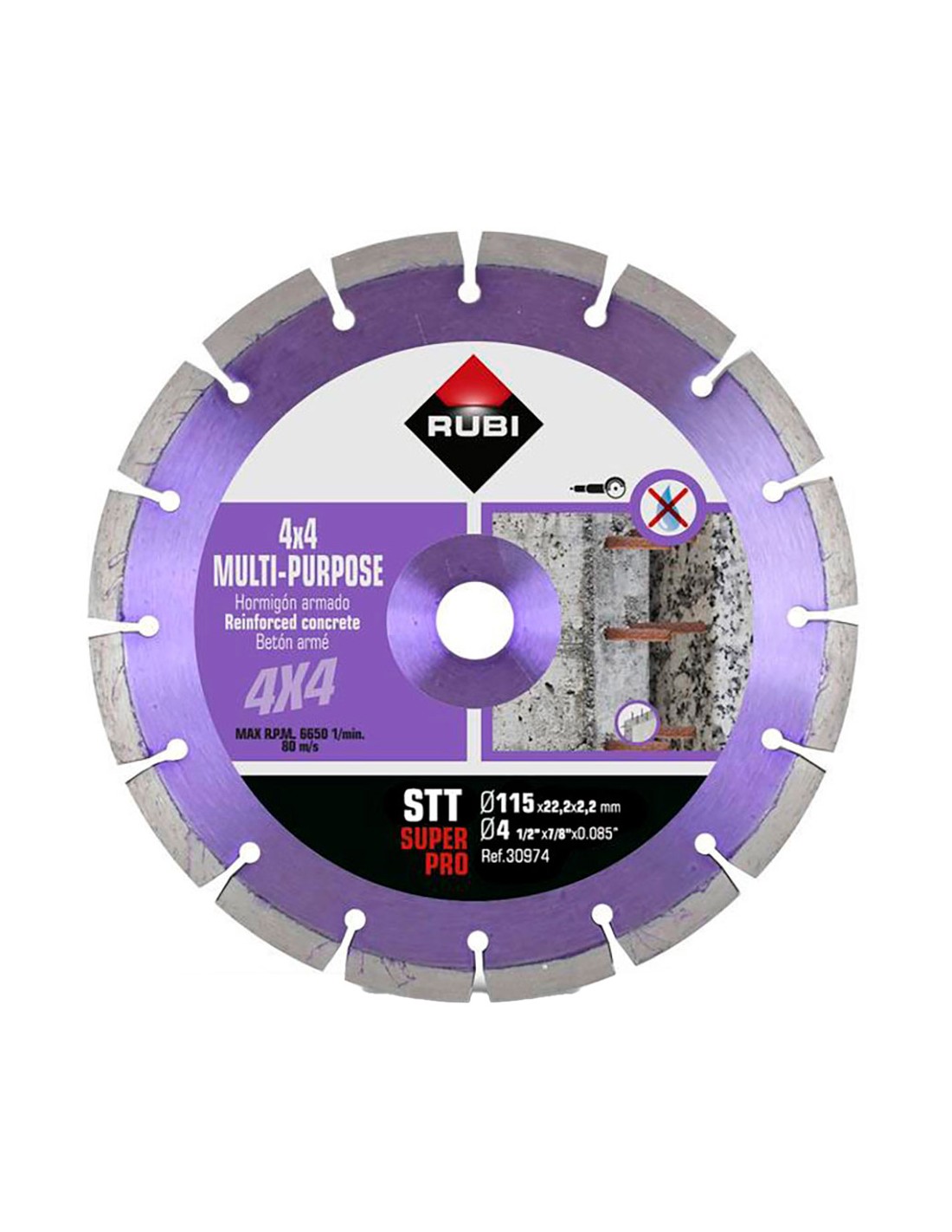 Disco diamantado stt ø115 mm superpro. para el corte, en seco y con amoladora, de cualquier tipo de material de obra como ladrillo, terrazo, hormigón, etc. todoterreno capaz de realizar cortes hasta en hormigón armado (varilla máxima recomendada de 6mm). alma perforada para reducir las tensiones que se puedan generar durante el corte y facilitar una mayor velocidad de corte