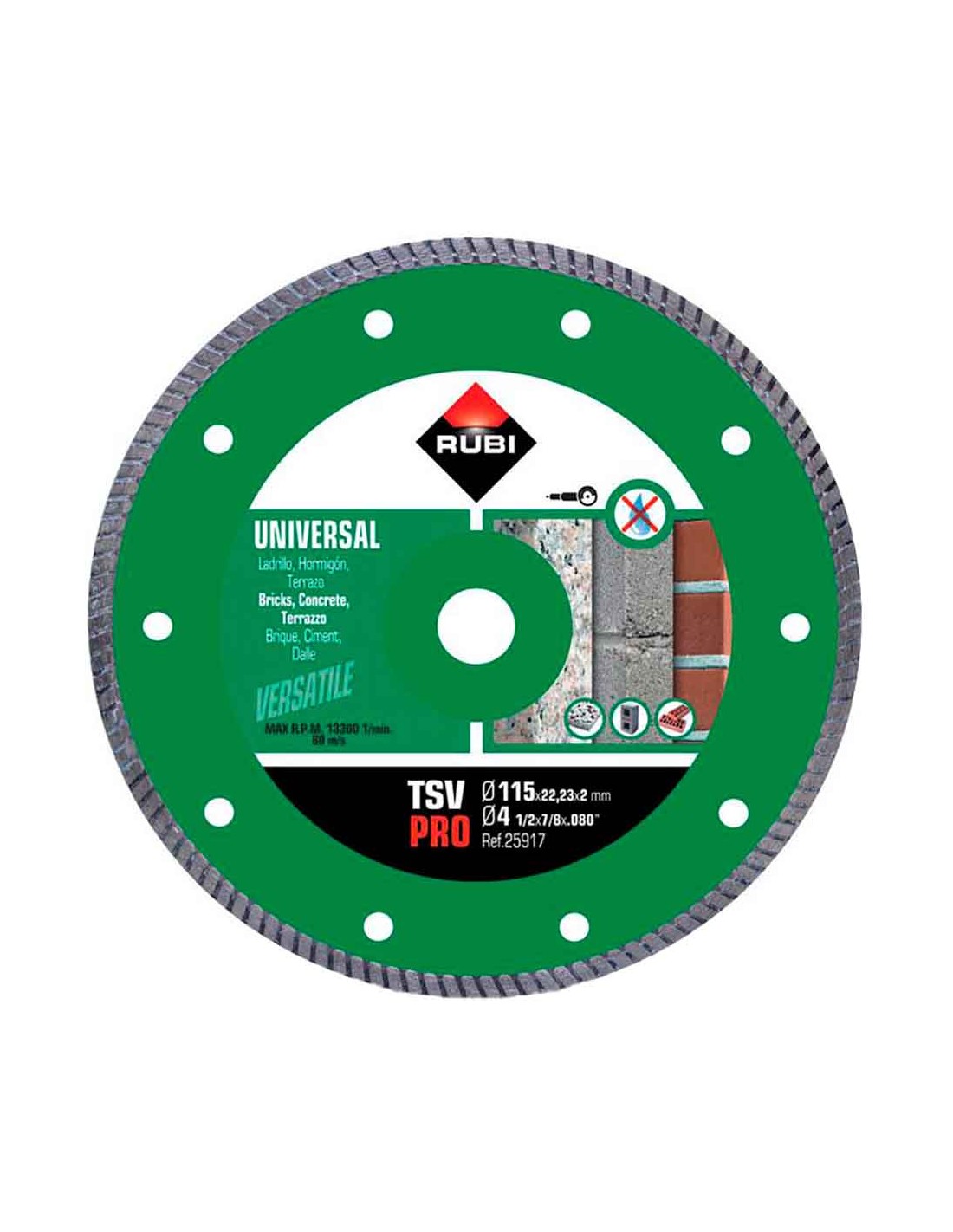 Disco diamantado tsv ø115 mm pro. recomendado para el corte, en seco y con amoladora, de materiales generales de obra como ladrillo, hormigón y terrazo. una gran combinación: alto rendimiento y velocidad de corte con acabados de alta calidad. combinan, en un solo disco, un óptimo nivel de calidad en el acabado del corte junto con una buena velocidad de corte
