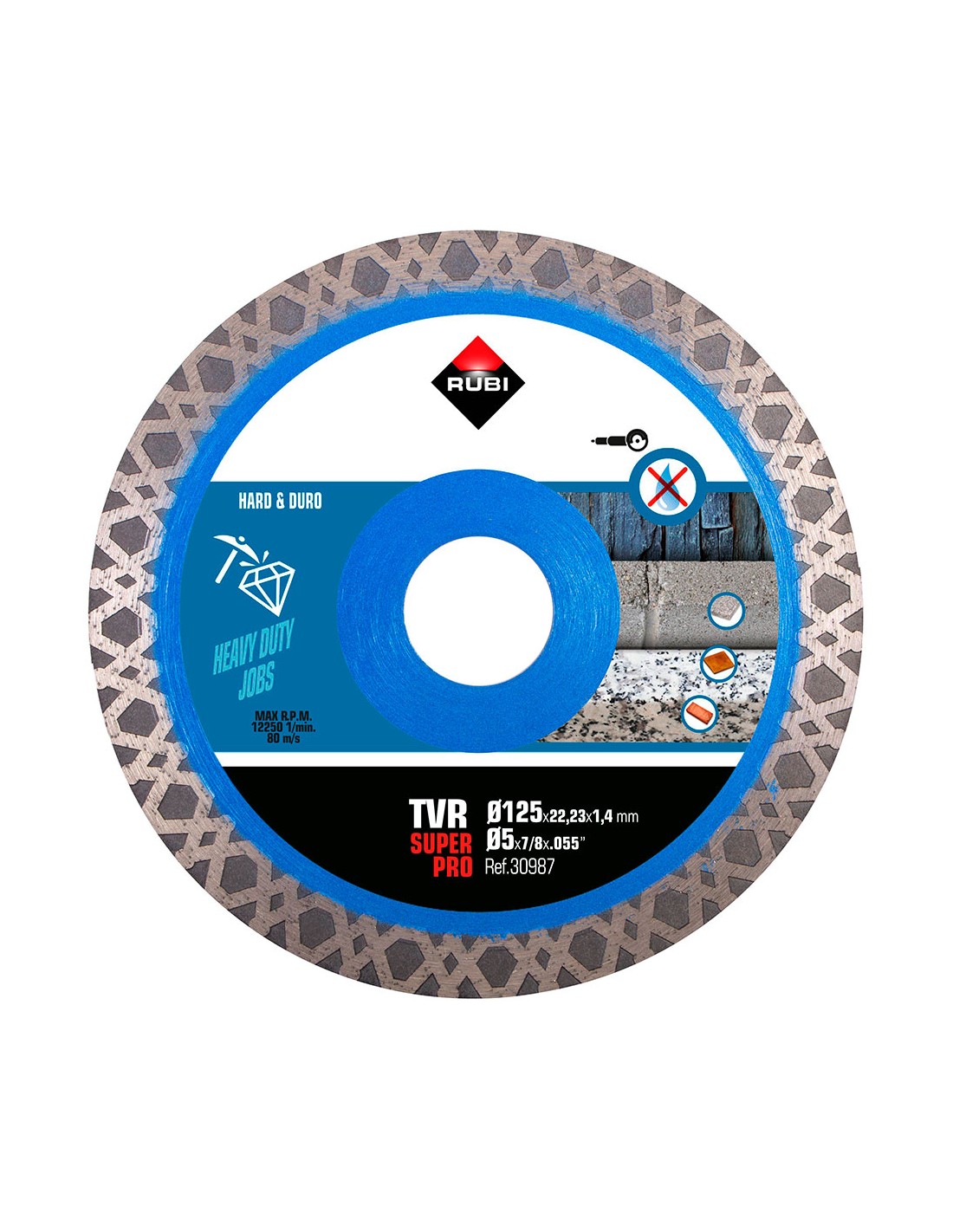 Disco diamantado tvr ø125 mm superpro. recomendado para el corte en seco de materiales duros como:granito,gres rústico, clínker, refractarios, pizarra y, por supuesto,gres porcelánico. el diseño específico de la banda diamantada del disco diamantado aporta, al usuario profesional, una mayor velocidad y resistencia en el corte de los materiales más duros, sin renunciar a la calidad del acabado