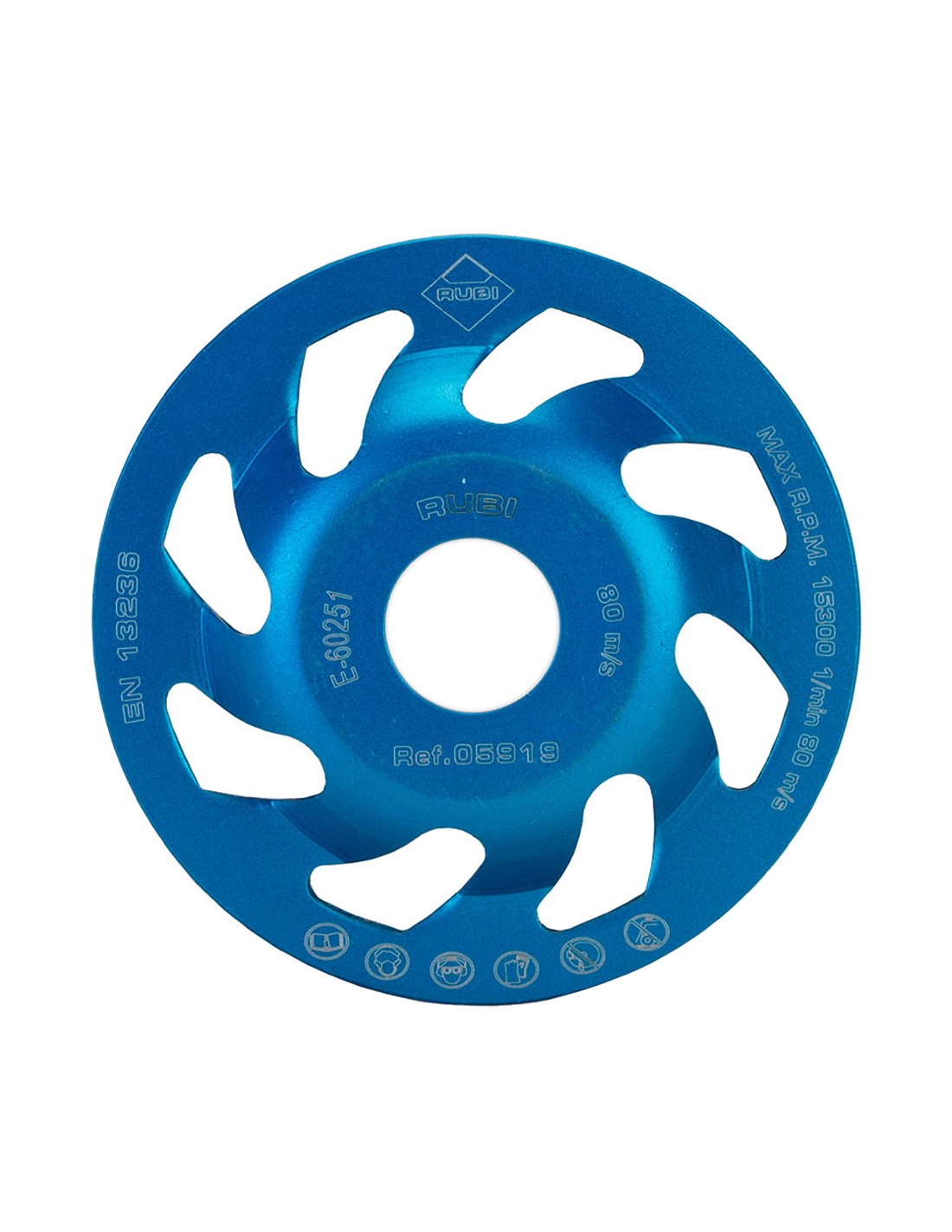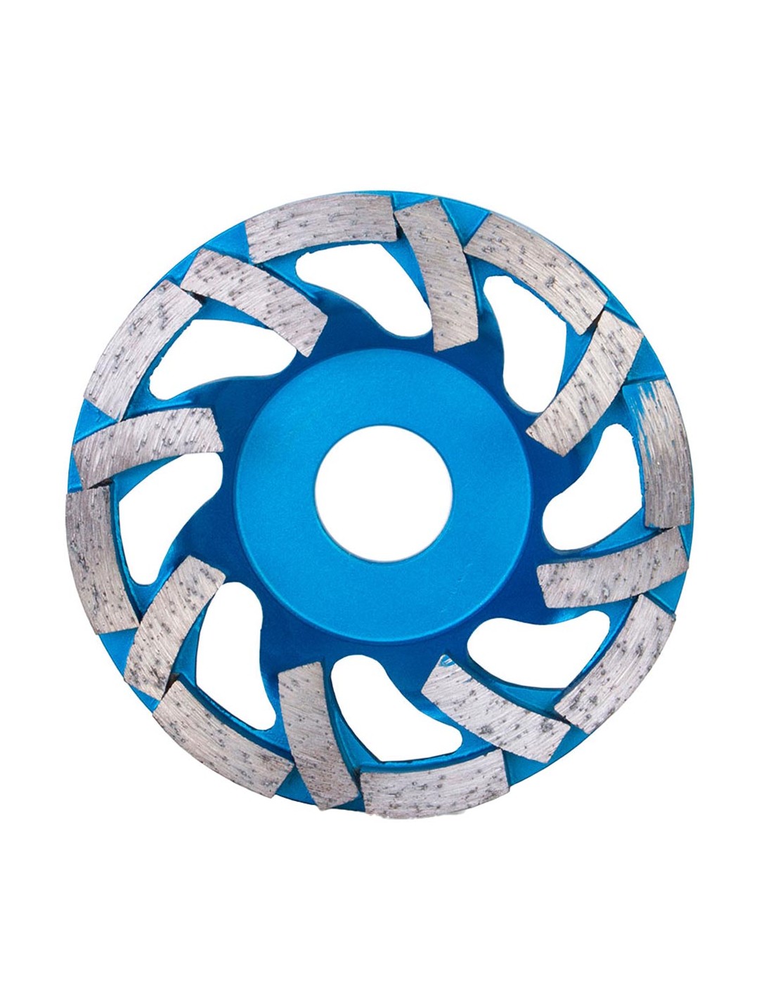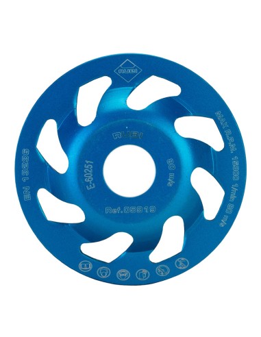 Muela desbaste fan cup para hormigón ø100 mm. los segmentos sinterizados se fijan al cuerpo de acero, de altas prestaciones, de la muela mediante la técnica de la soldadura láser, la más fuerte y resistente.el diseño específico del cuerpo de acero y la disposición perpendicular de los segmentos de diamante facilitan la evacuación de los restos de material de desbaste e incrementan la refrigeración de la muela de diamante.