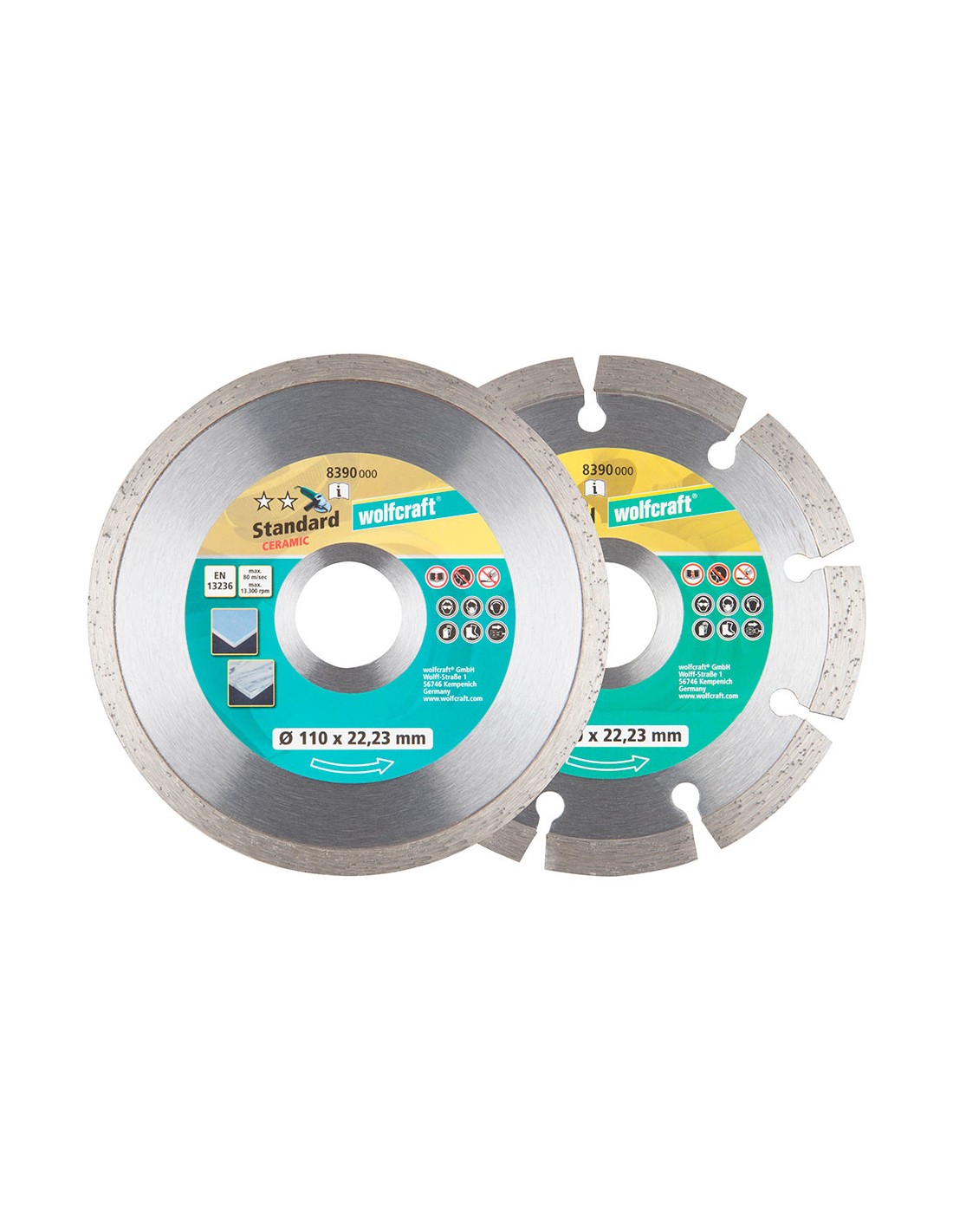 Disco diamantados de corte la alternativa económica - ideal para todos los principiantes y bricoladores ocasionales piezas en el juego: 2 piezas contenido: 1 disco segmentado para cortar ladrillos, piedra natural y baldosas de cemento y 1 disco para azulejos para cortes lisos y limpios en mármol, azulejos y baldosas de cerámica diámetro de trabajo: ø110mm alojamiento del agujero: 22.23mm altura de segmento: 5mm velocidad máx. de rotación: 13.300 rpm