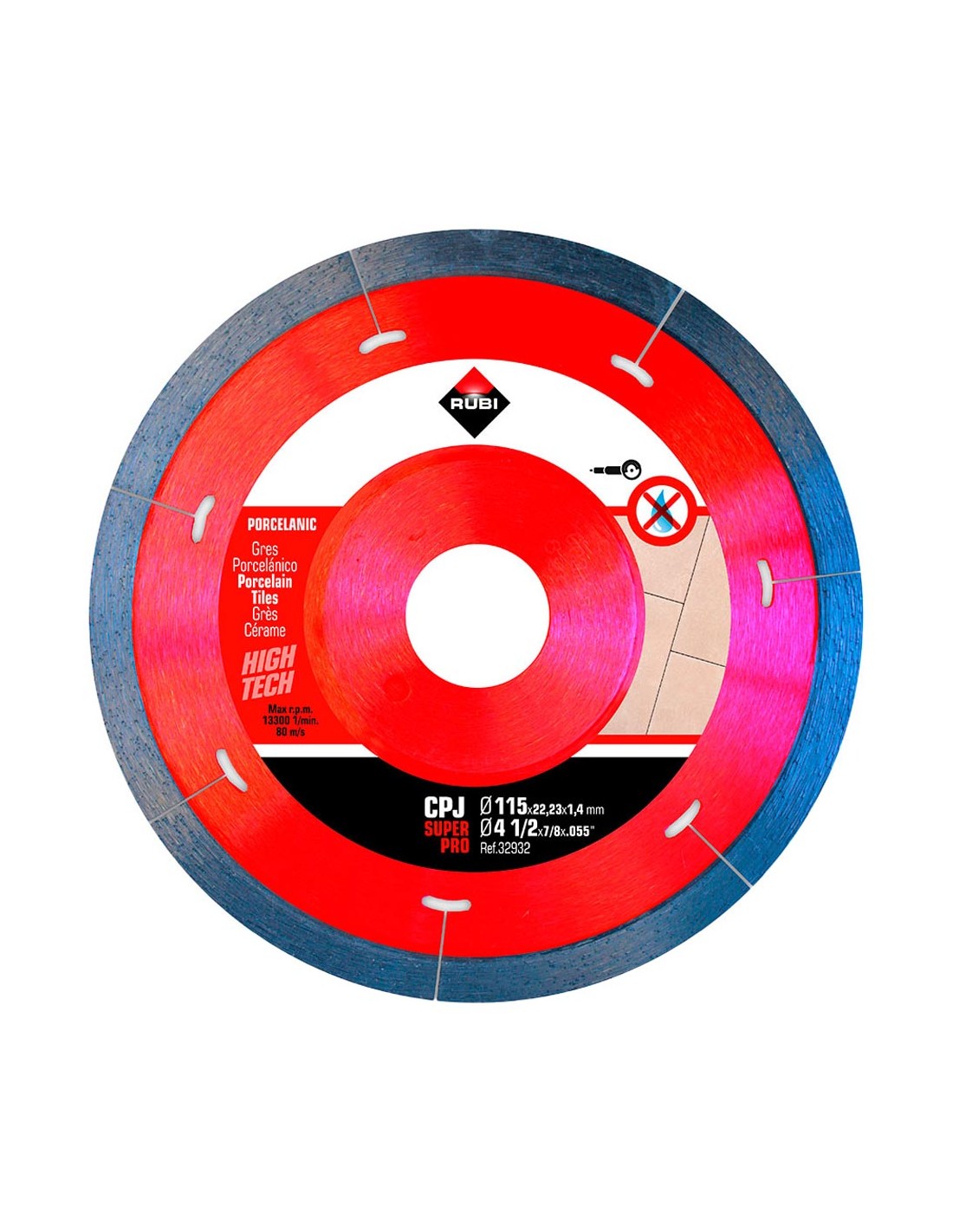 Disco diamantado corte cpj ø115 mm superpro. corte seco paragres porcelánico. especialmente diseñado para ofrecer al profesional de la colocación de baldosa cerámica el mejor rendimiento. recomendado para cortes rectos en baldosas degres porcelánico y en especial en aquellos trabajos en los que sea necesaria unagran velocidad de corte sin renunciar a unos altos niveles de rendimiento y calidad.no es apto para la ejecución del corte a inglete con amoladora