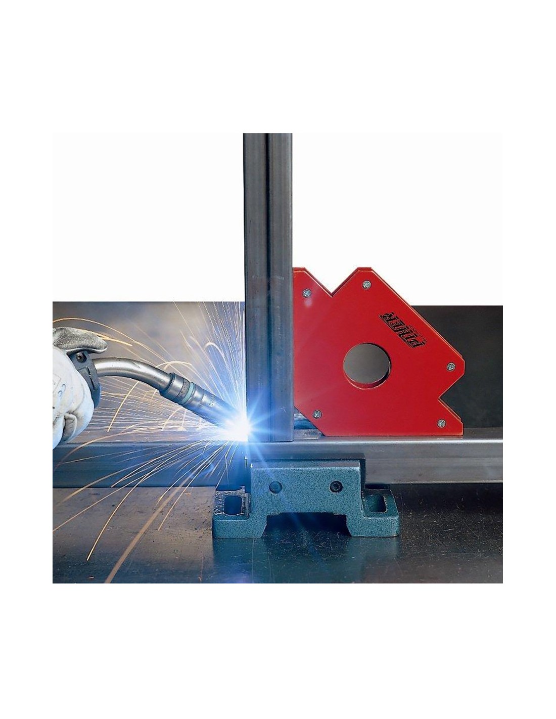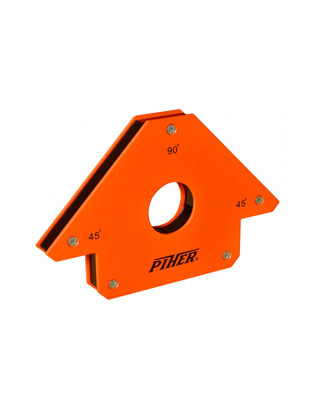 Escuadra magnética q1 piher ref. 29003. chapas de acero de 1,5mm. de espesor. pintura epoxy naranja ral2002, protector exterior de la ferrita fabricado en baquelita. capacidad de 45° y 90°. uso industrial profesional. iman de ferrita permanente de 1100 gauss y protegido con baquelita. tornillos de métrica 4 pasantes y roscados. iman: 60-32/10mm. peso: 0,30kg. medidas: 8,5x15cm.
