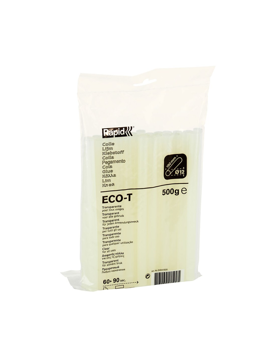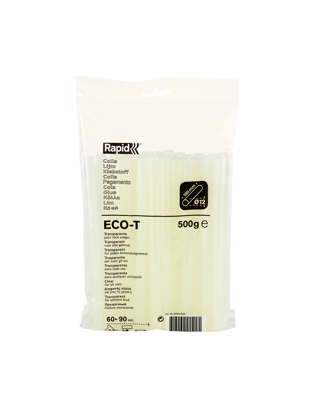 Barra de cola termofusible eco t, transparente, para uso universal, temperatura de aplicación 160 - 200 c. ø12 x 190 mm, 500 g