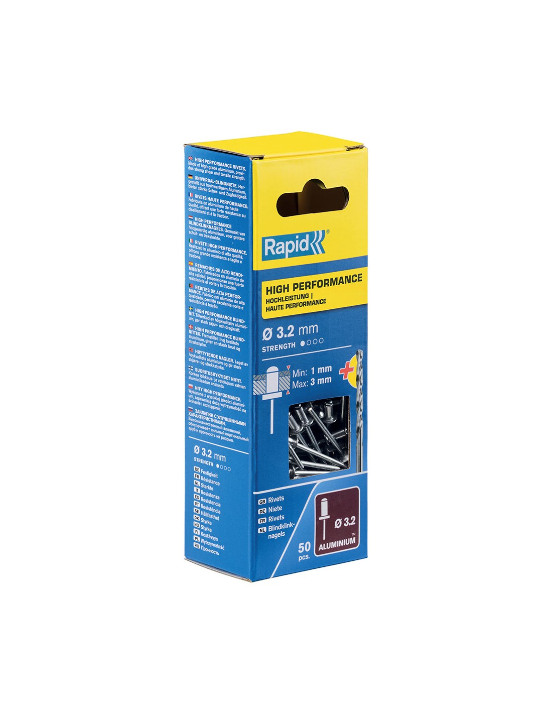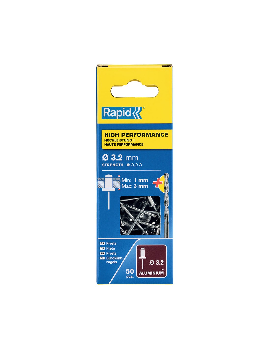 Blister 50 remaches ø3.2x6mm. alu+broca 5001528 rapid. estos remaches de aluminio de alto rendimiento son perfectos para fijar materiales que se encuentren en lugares expuestos, como guardabarros, revestimientos de metal y plástico, señalizaciones y placas metálicas. en el embalaje se incluye una broca del tamaño adecuado.