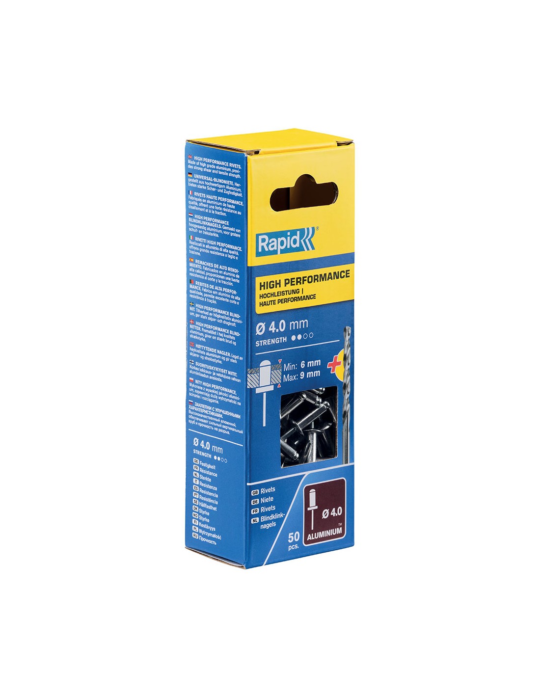 Blister 50 remaches ø4x12mm. alu+broca 5000384 rapid. estos remaches de aluminio de alto rendimiento son perfectos para fijar materiales que se encuentren en lugares expuestos, como guardabarros, revestimientos de metal y plástico, señalizaciones y placas metálicas. en el embalaje se incluye una broca del tamaño adecuado.