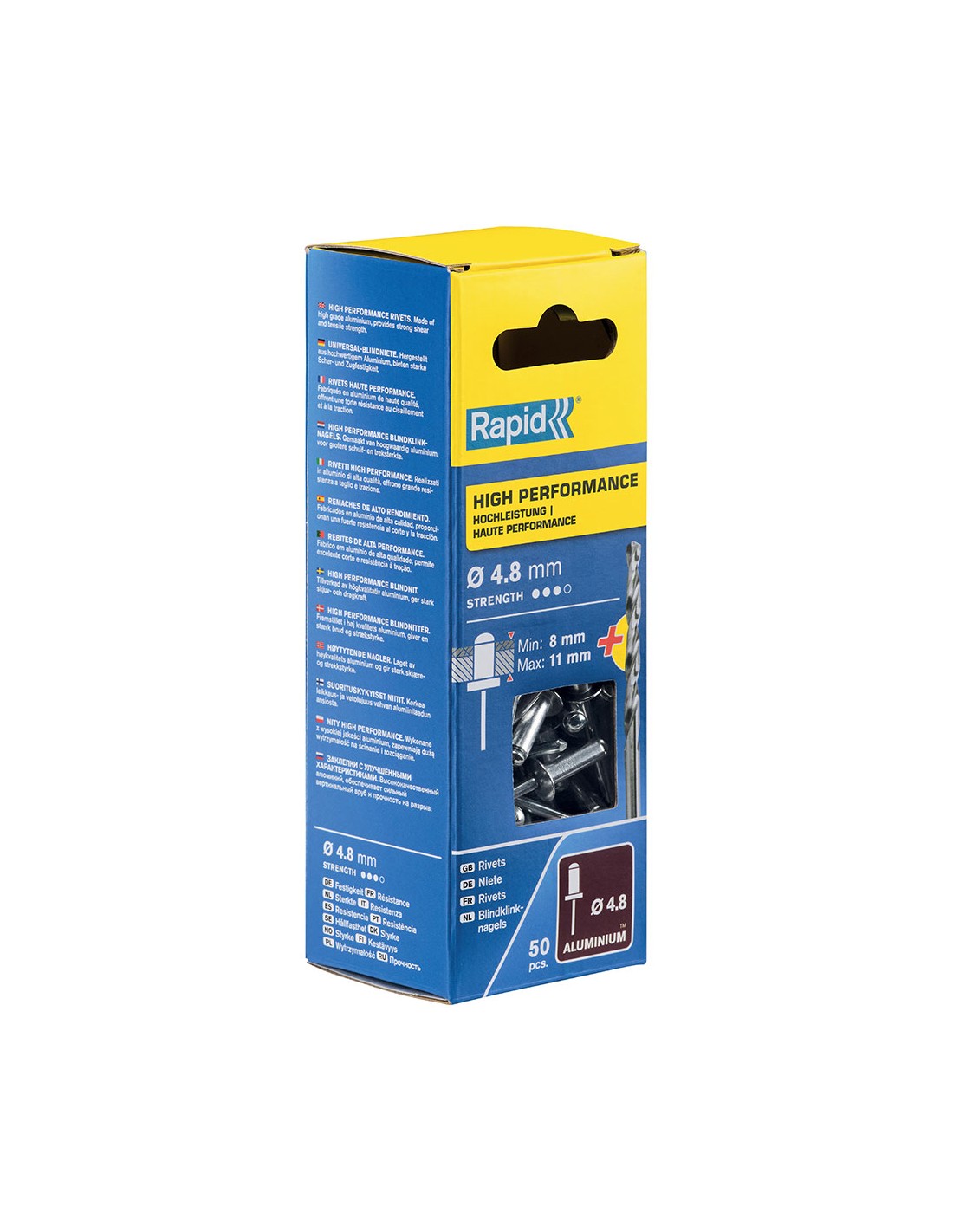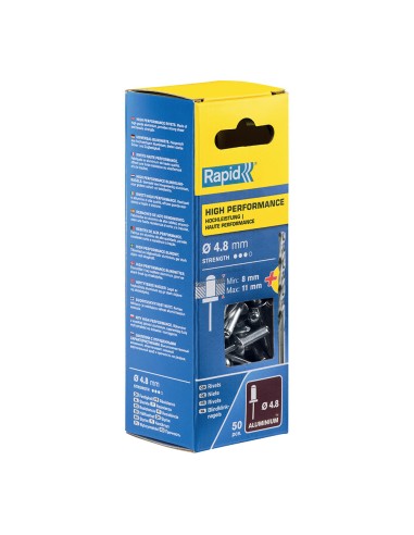 Blister 50 remaches ø4,8x14mm. alu+broca 5000389 rapid. estos remaches de aluminio de alto rendimiento son perfectos para fijar materiales que se encuentren en lugares expuestos, como guardabarros, revestimientos de metal y plástico, señalizaciones y placas metálicas. en el embalaje se incluye una broca del tamaño adecuado.