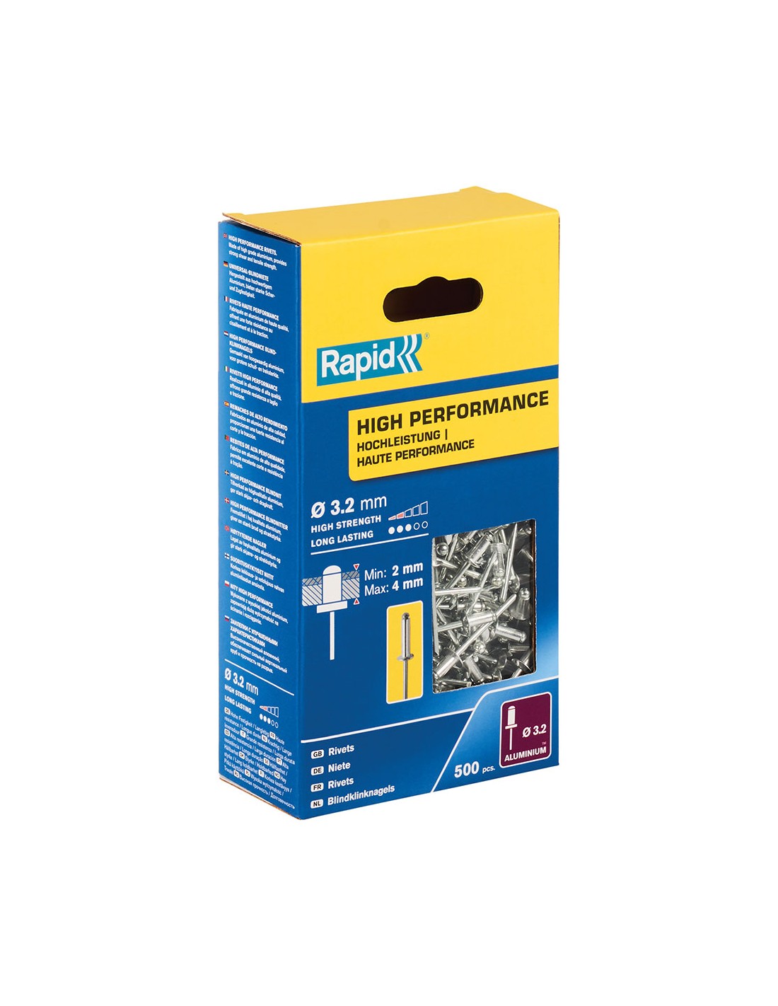 Caja 500 remaches ø3.2x8mm - alto rendimiento 5001431 rapid. estos remaches de aluminio de alta calidad son perfectos para fijar materiales que puede estar en lugares expuestos, como guardabarros, revestimientos de metal y plástico, señalizaciones y láminas de metal. caja grande con 500 remaches.