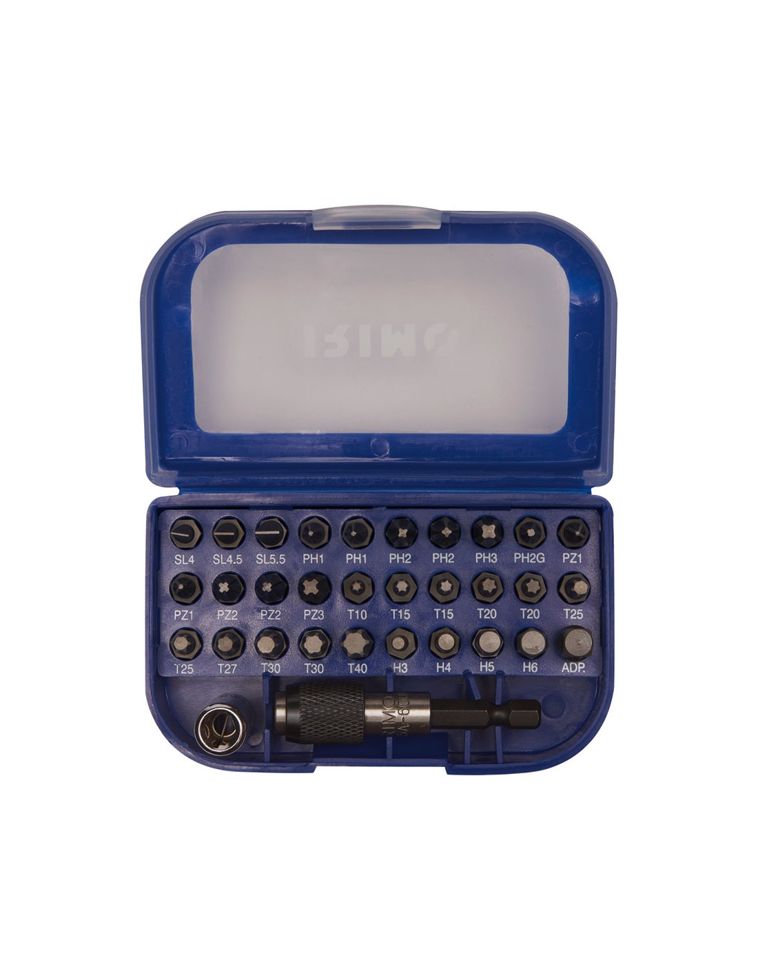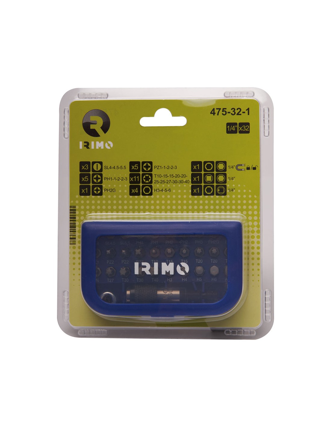 Juego puntas 1/4 con portapuntas magnético, 32 piezas 475-32-1. incluye 29puntas, 1portapuntas magnético de liberación rápida, 1adaptador para vasos y 1adaptador para puntas. cuadradillo hexagonal de 1/4. para tornillos ranurados, phillips, pozidriv, torx® y hexagonales. -ranurados: 4,0, 4,5 y 5,5. -phillips: 2ph1, 2ph2, ph3 y ph2g. -pozidriv: 2pz1, 2pz2 y pz3. -torx: t10, 2t15, 2t20, 2t25, t27, t30 y t40. -hexagonales: h3, h4, h5 y h6. adaptador para puntas hembra de 1/4" para puntas hexagonales hembra de 1/4". adaptador para vasos con cuadrado de 1/4", con bola para llave de vaso normal (estilo c6.3). portapuntas magnético con liberación rápida y sistema de bloqueo (estilo e6.3). en una pequeña caja de plástico con clip para el cinturón. en blíster. din 3126, iso 1173, estilo c 6.3."