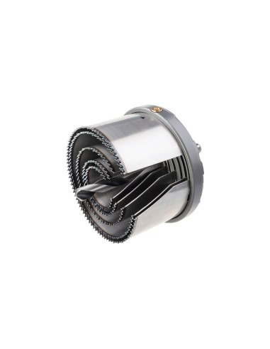 Sierra de corona múltiple professional, ø28 - 74 mm. 5 sierras (28, 35, 50, 68, 74 mm), profundidad de corte 40 mm. ideal para madera, plástico, aislamiento, yeso. vástago hexagonal, compatible con taladradoras y atornilladores. bloqueo de seguridad para fijación fiable. perfecta para proyectos interiores