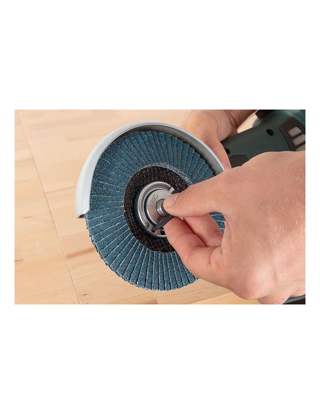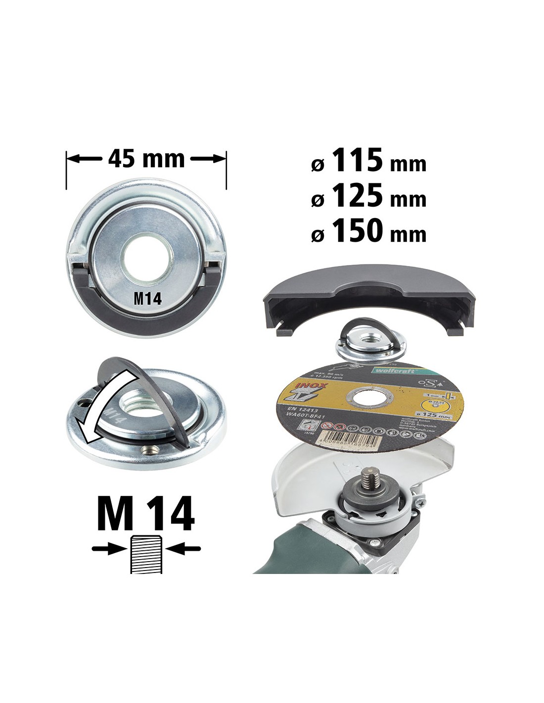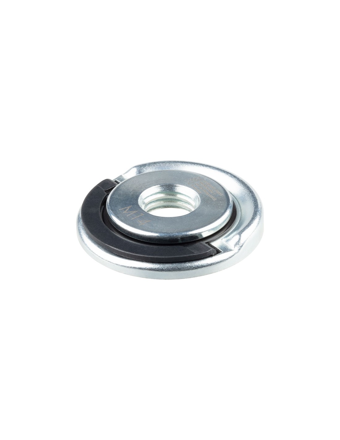 La tuerca de fijación rápida permite cambiar, rápidamente y sin herramientas, discos de corte, desbastado y lijado con un diámetro de hasta 125 mm. dispone de una palanca abatible que queda encajada de forma segura en la posición de 0° y de 90°. con un movimiento giratorio manual hacia la izquierda o la derecha se suelta y fija la tuerca de amoladora con rapidez y comodidad. en caso necesario, esto también puede realizarse con una llave de amoladora. también están disponibles las sujeciones correspondientes. gracias a la rosca m14, la tuerca de fijación rápida es compatible con amoladoras angulares disponibles en el mercado.