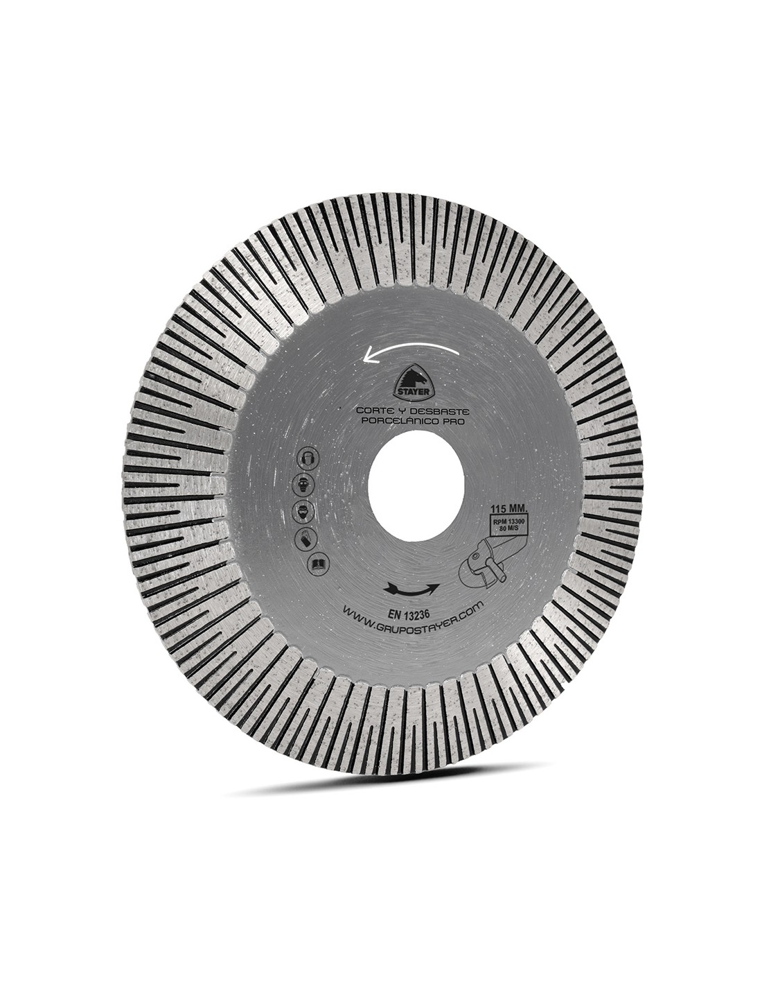 Disco corte y desbaste de porcelánico pro ø125 mm, rpm 12250. para porcelanato, ferrogres, granito, pizarra y terrazo. corona diamantada de 10 mm y recubrimiento diamantado de otros 10 mm en una cara del disco. permite repasar y achaflanar los cantos para obtener un acabado perfecto