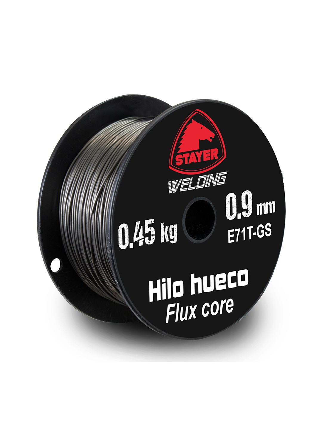 Bobina de hilo hueco tubular 0,45kg ø0,9 mm. e71t-gs. auto protegido para soldadura dc sin gas, para utilizar con equipos mig-mag sin necesidad de uso de gases protectores, soldadura limpia sin escoria o residuos especialmente indicadas para soldadura de aceros al carbono, aptas para el soldado de placas zincadas, excelente rendimiento soldando en todo tipo de posiciones.