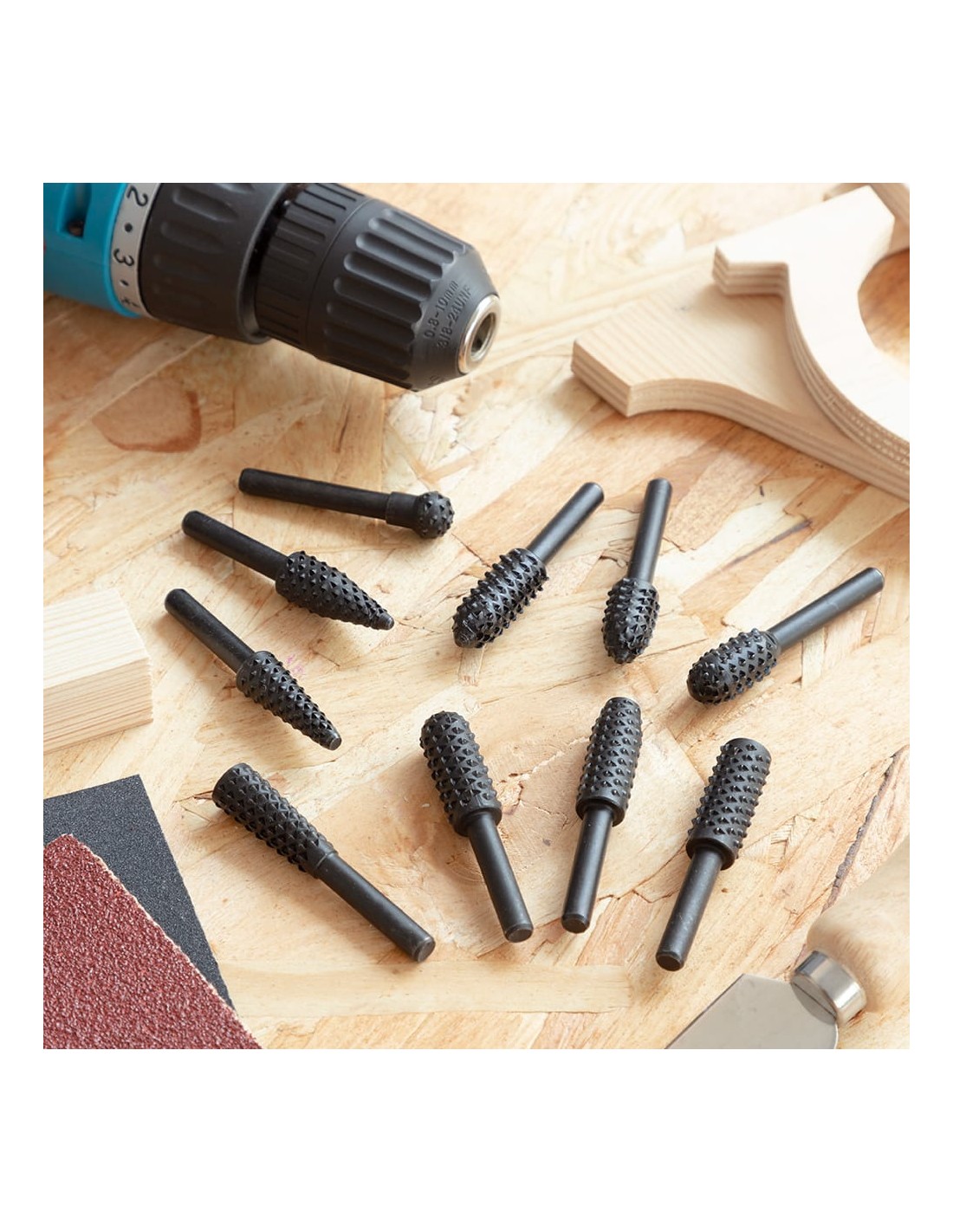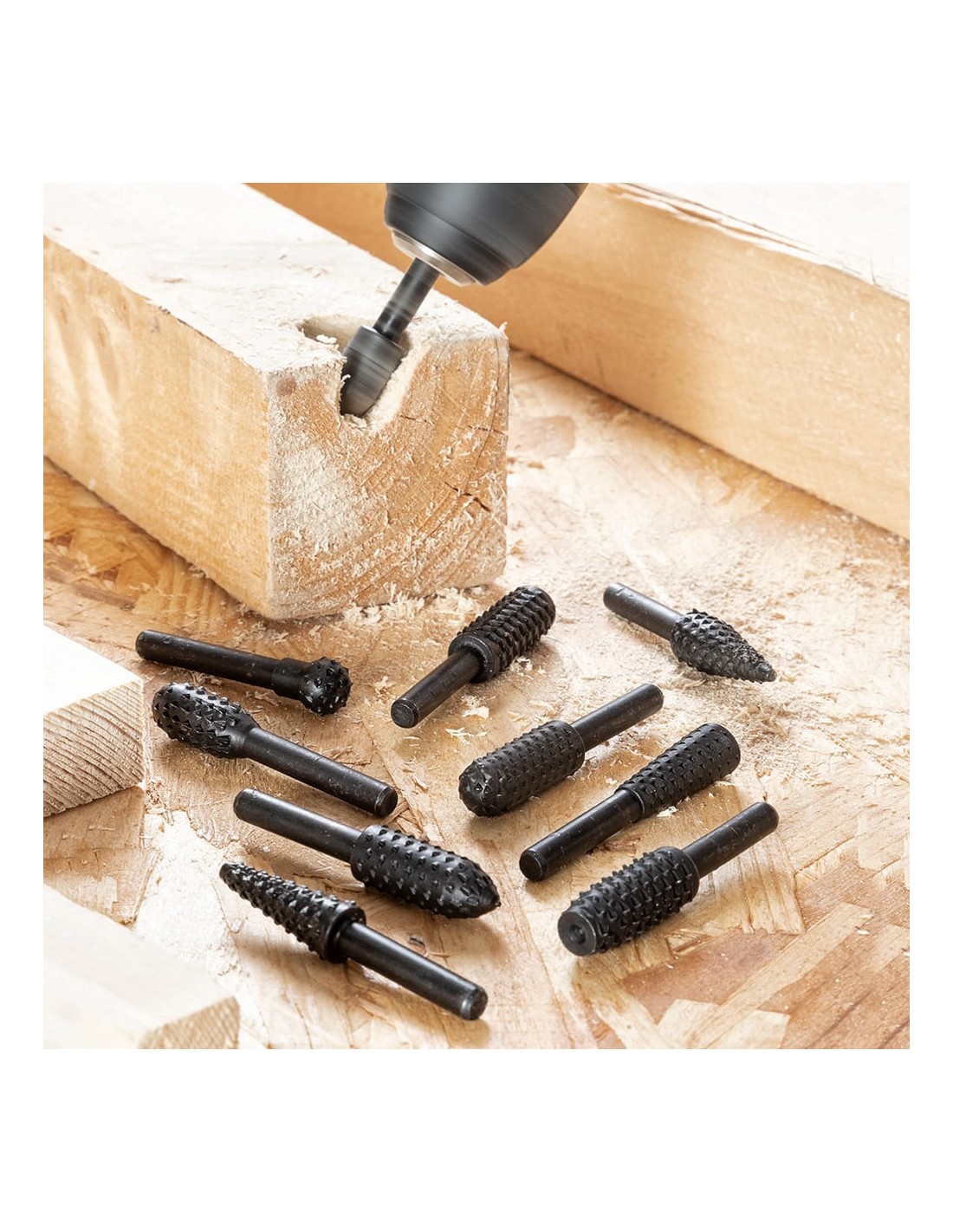 Set de fresas para taladro driwills, incluye varias fresas intercambiables. eje ø6,3 mm. 58 x 12 mm. funciones:fresar, esmerilar, pulir, etc. solo apto para superficies de madera y pvc (no apto para hierro ni acero) material: acero hcs (acero al carbono) negro. velocidad máxima: 20000 r.p.m.