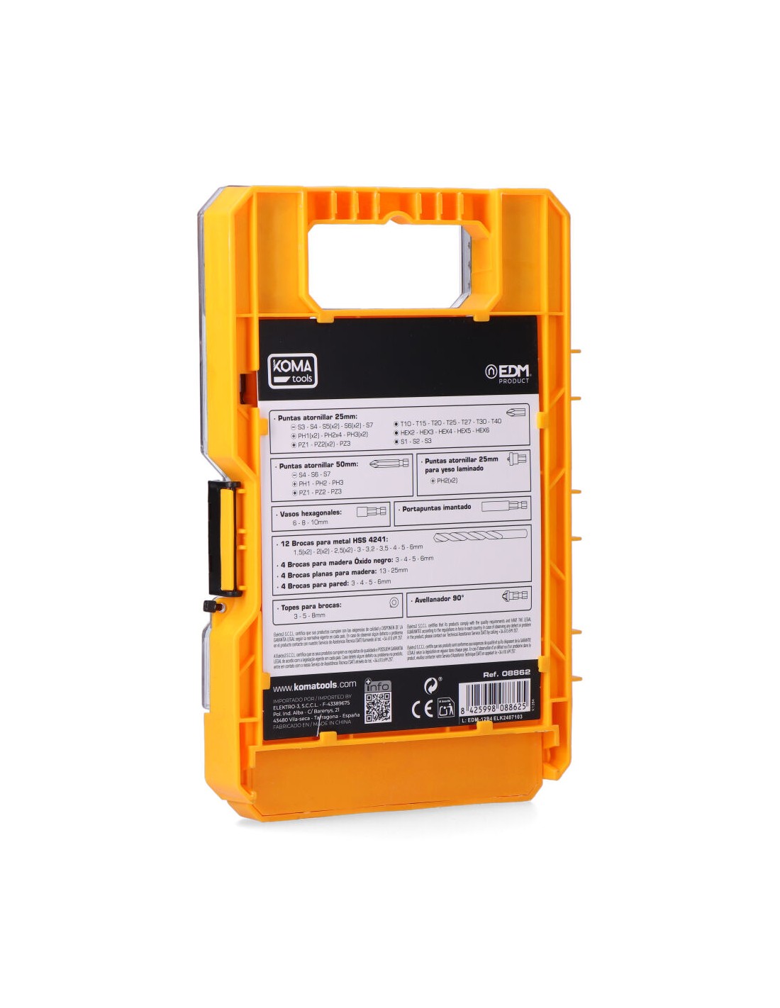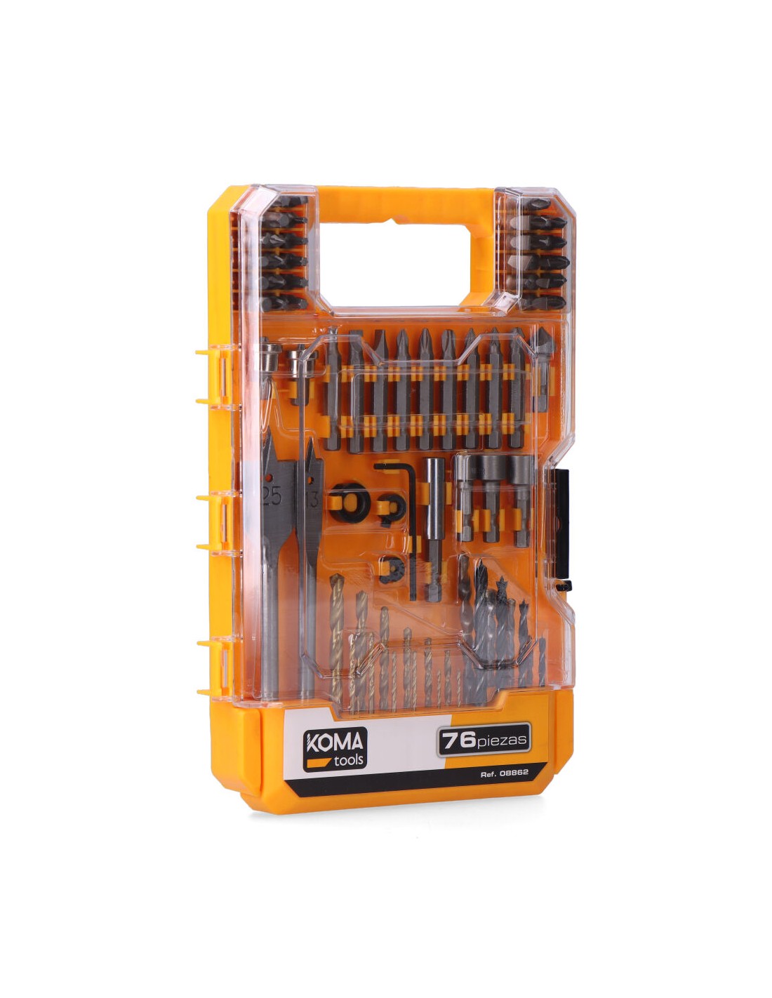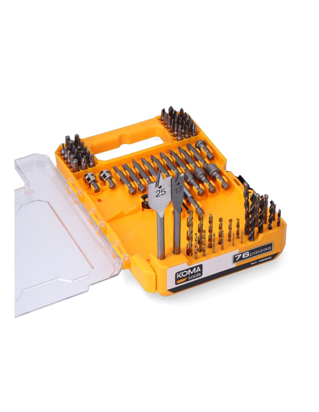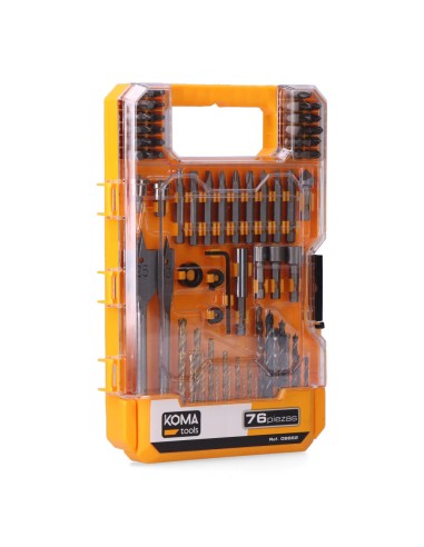 Maletín de puntas de destornillador y brocas contiene 76 piezas. 12 brocas de metal hss 4241 con recubrimiento titanio: 1,5(x2), 2(x2), 2,5(x2), 3-3,2-3,5-4-5-6 mm 4 brocas madera óxido negro: 3-4-5 y 6 mm 2 brocas planas para madera: 13-25 mm 4 para pared: 3-4-5-6 mm 34 puntas 25 mm: s3-s4-s5(x2)-s6(x2)-s7-ph1(x2)-ph2(x4)-ph3(x2)-pz1-pz2(x2)-pz3-t10-t15-t20-t25-t27-t30-t40-hex2-hex3-hex4-hex5-hex6-s1-s2-s3. 9 puntas 50 mm: s4-s6-s7-ph1-ph2-ph3-pz1-pz2-pz3. puntas para yeso laminado 25 mm: ph2(x2). 3 vasos hexagonales: 6-8-10 mm 1 porta puntas imantado 1 avellanador 90 3 topes para brocas. medidas 25,5 x 3,6 x 17 cm