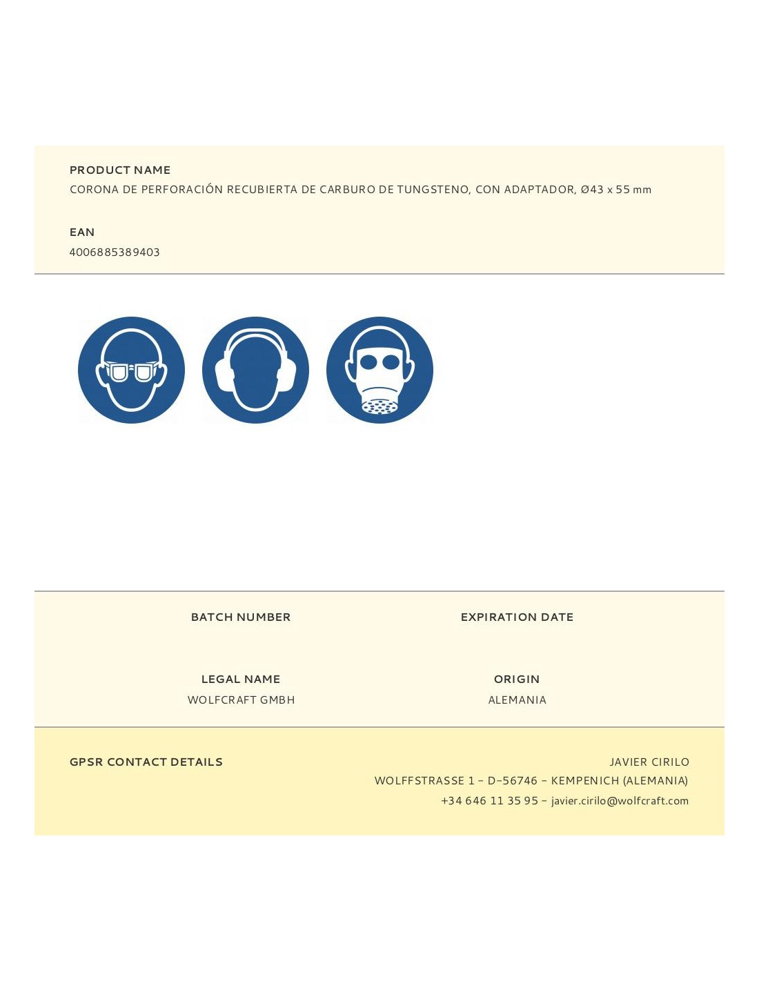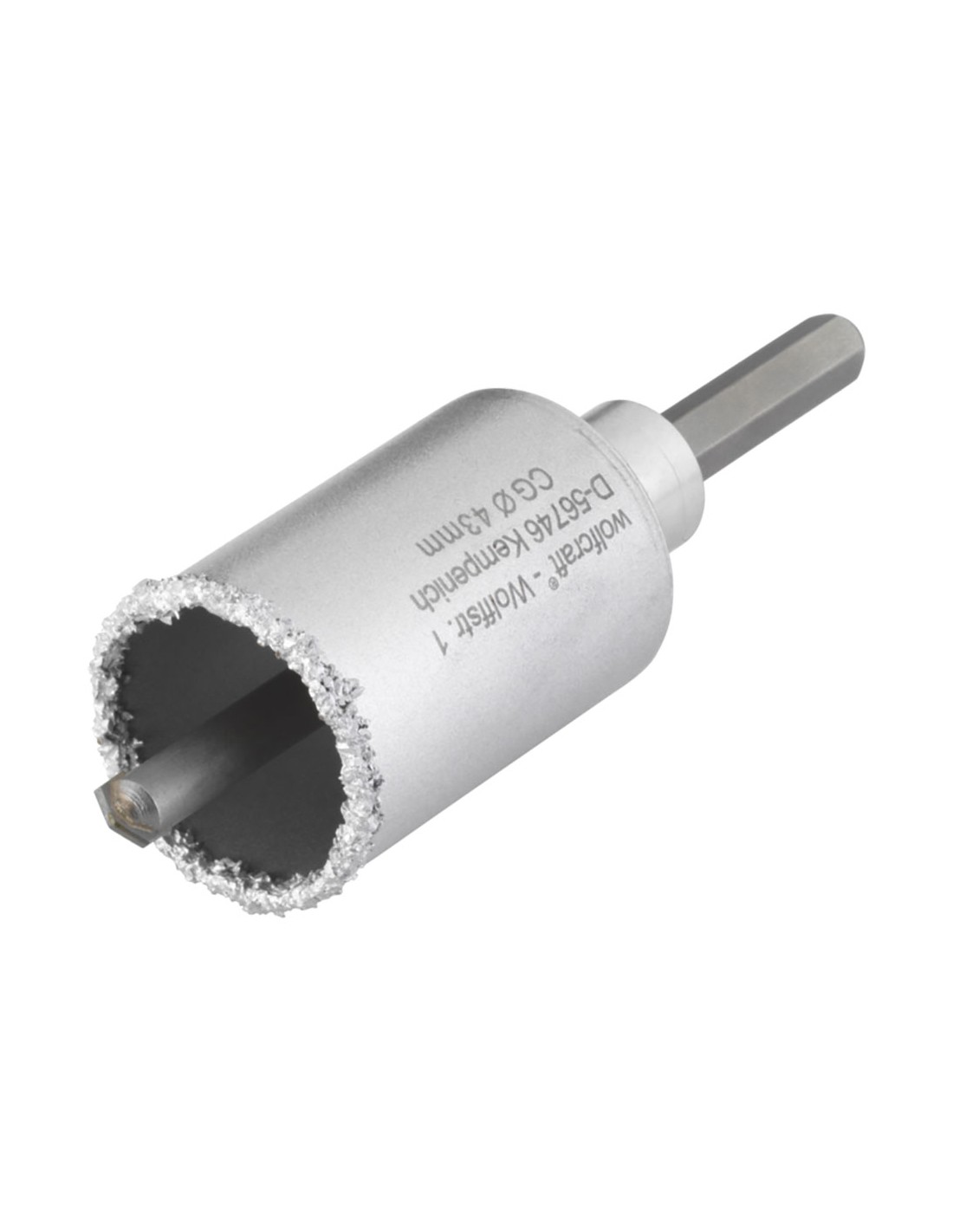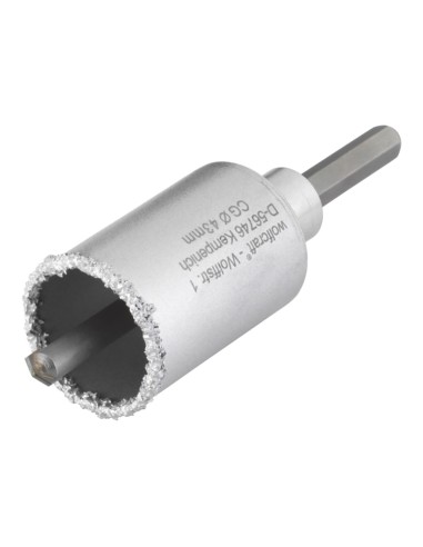 Corona de perforación recubierta de carburo de tungsteno, ø43 x 55 mm, profundidad máxima de corte 55 mm velocidad máxima de rotación 1.500 rpm para taladros en paredes de ladrillo y piedra, vástago hexagonal,con adaptador y broca centradora (ø8mm) preinstalados, certificación tüv