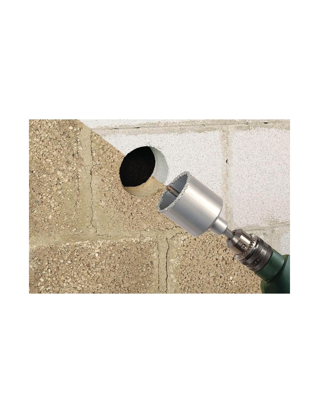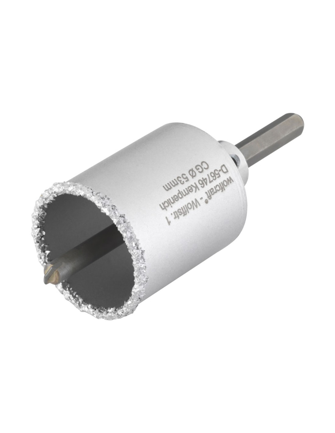 Corona de perforación recubierta de carburo de tungsteno, ø53 x 55 mm, profundidad máxima de corte 55 mm velocidad máxima de rotación 1.200 rpm para taladros en paredes de ladrillo y piedra, vástago hexagonal,con adaptador y broca centradora (ø8mm) preinstalados, certificación tüv