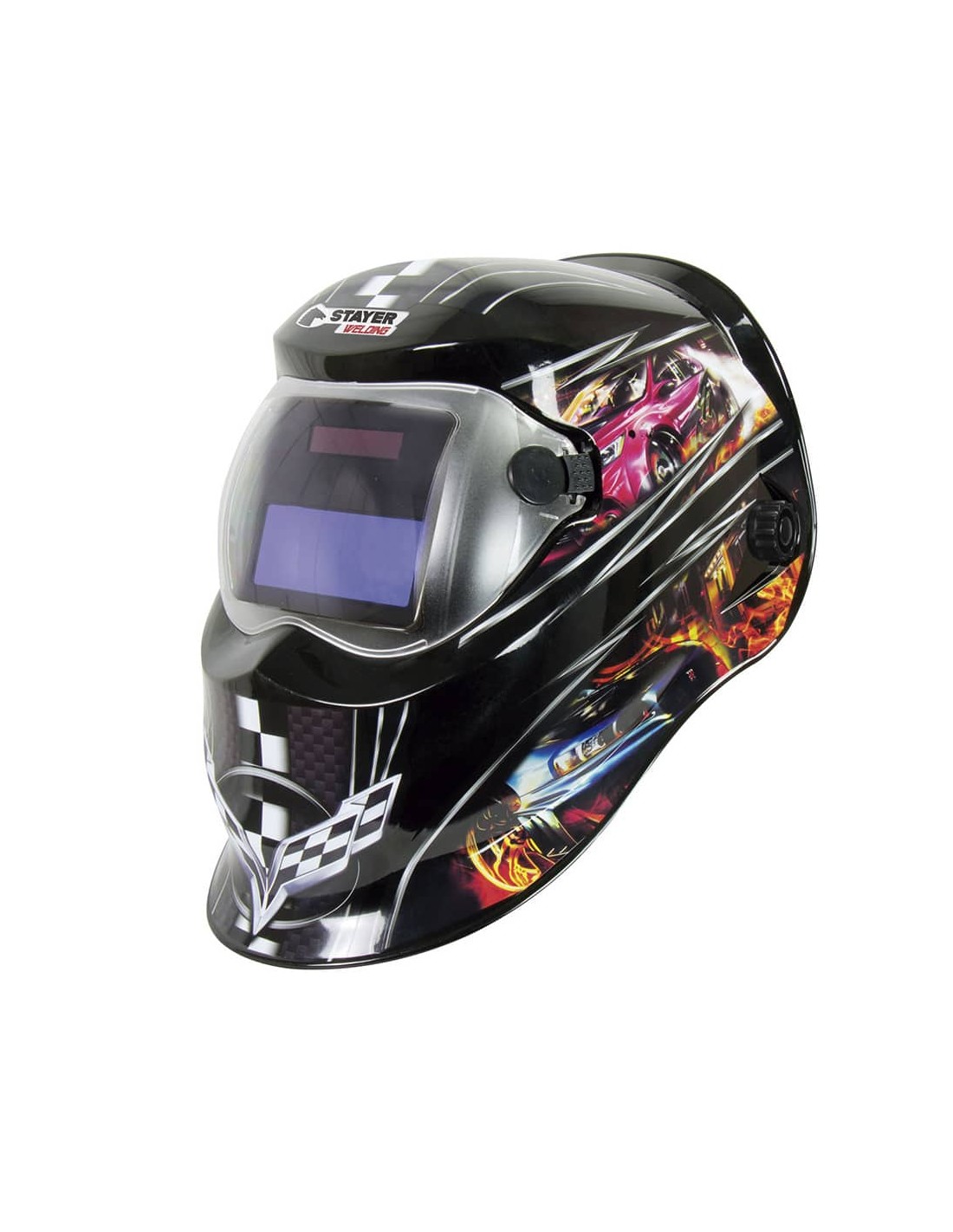 Pantalla de soldadura carnival auto de polímero alimentación solar, preparada para amolado, área de visión 92 x 35 mm, filtro automático 110 x 90 x 8 mm, tiempo de oscuridad a luz 0,2-0,8 grado protección en169 regulable de din9 a din13, en estado claro din4 protección uv/ir din15, temperatura uso -5°c/55°c