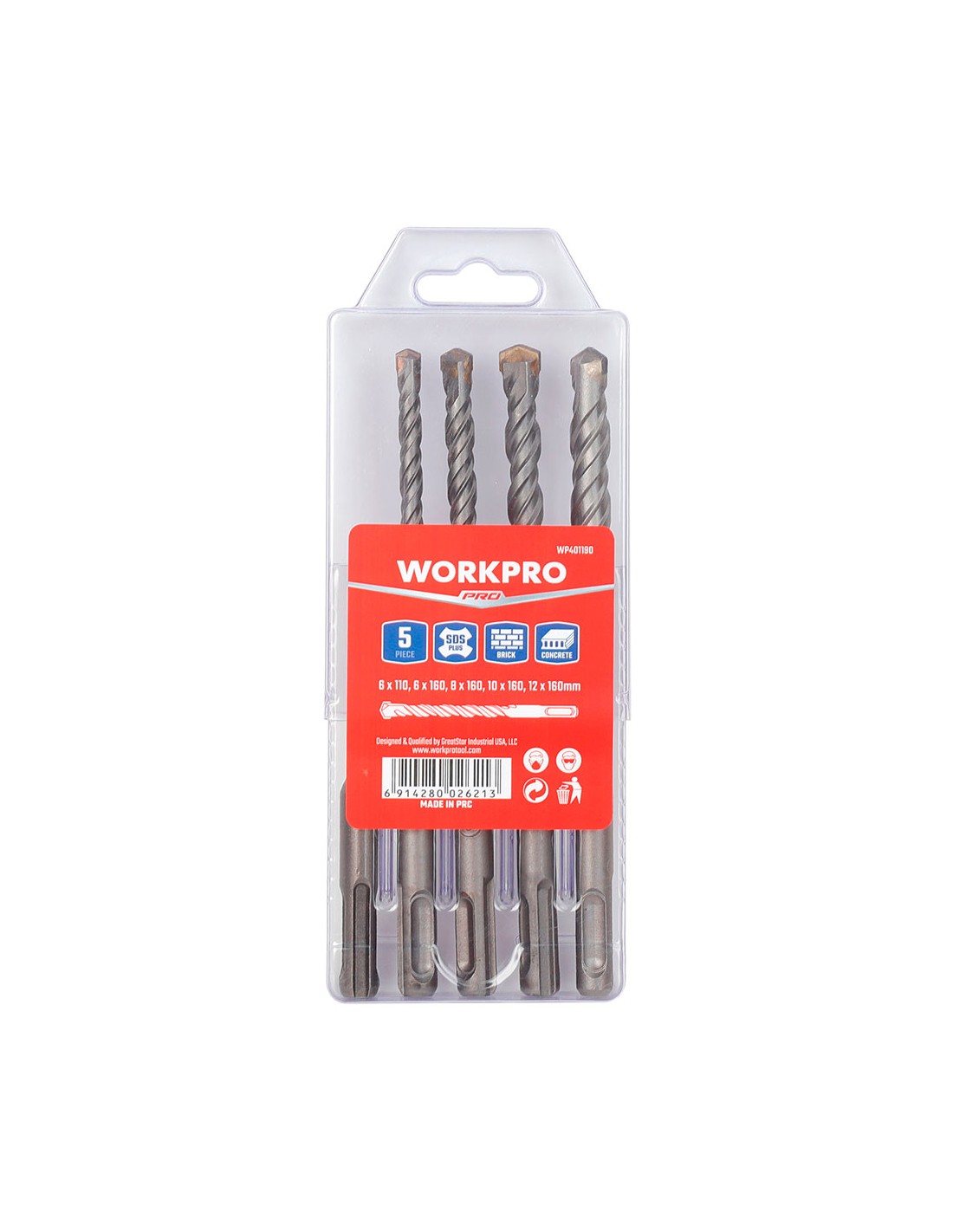 Brocas para mampostería con punta de carburo de tungsteno de alta calidad y vástago sds-plus acero 40cr, ranura en w, rápida extracción de virutas, juego 5 piezas, incluye: 1 uds ø6,00 x 110 mm 1 uds ø6,00 / ø8,00 / ø10,00 / ø12,00 x 160 mm para ladrillo, mampostería, hormigón, piedra, etc.