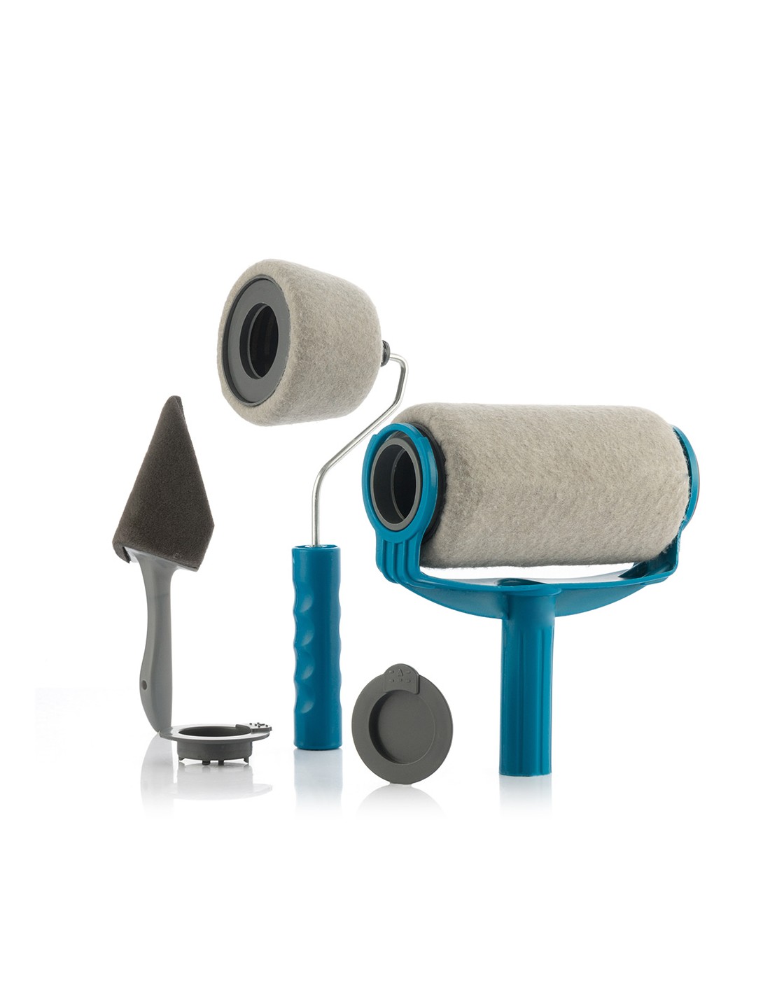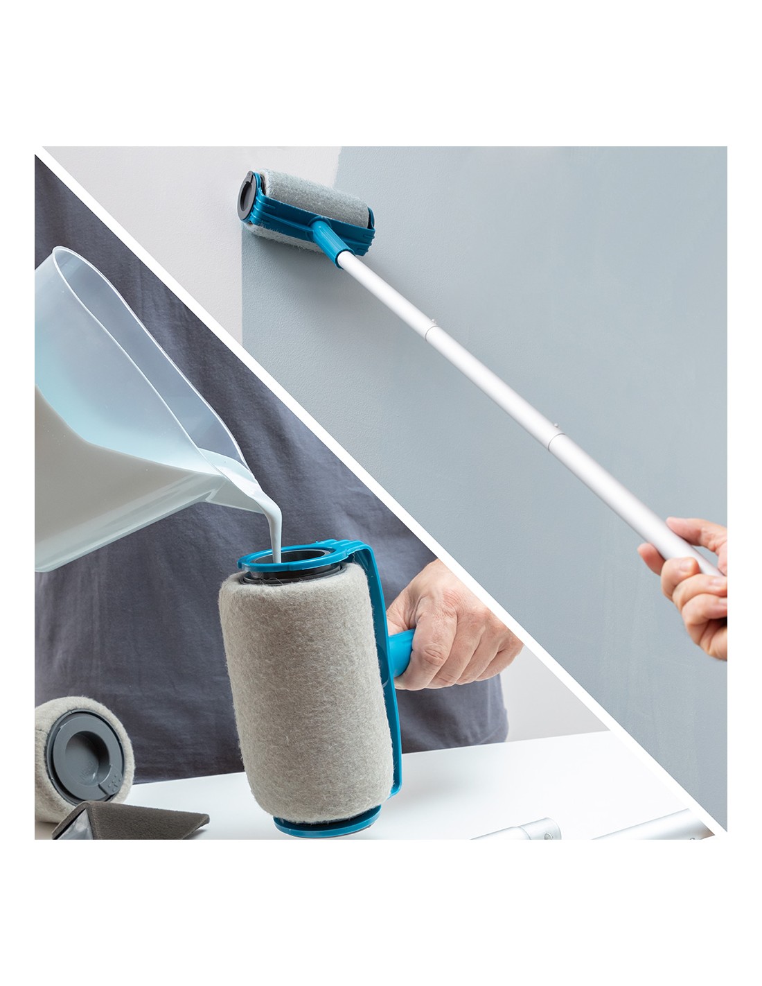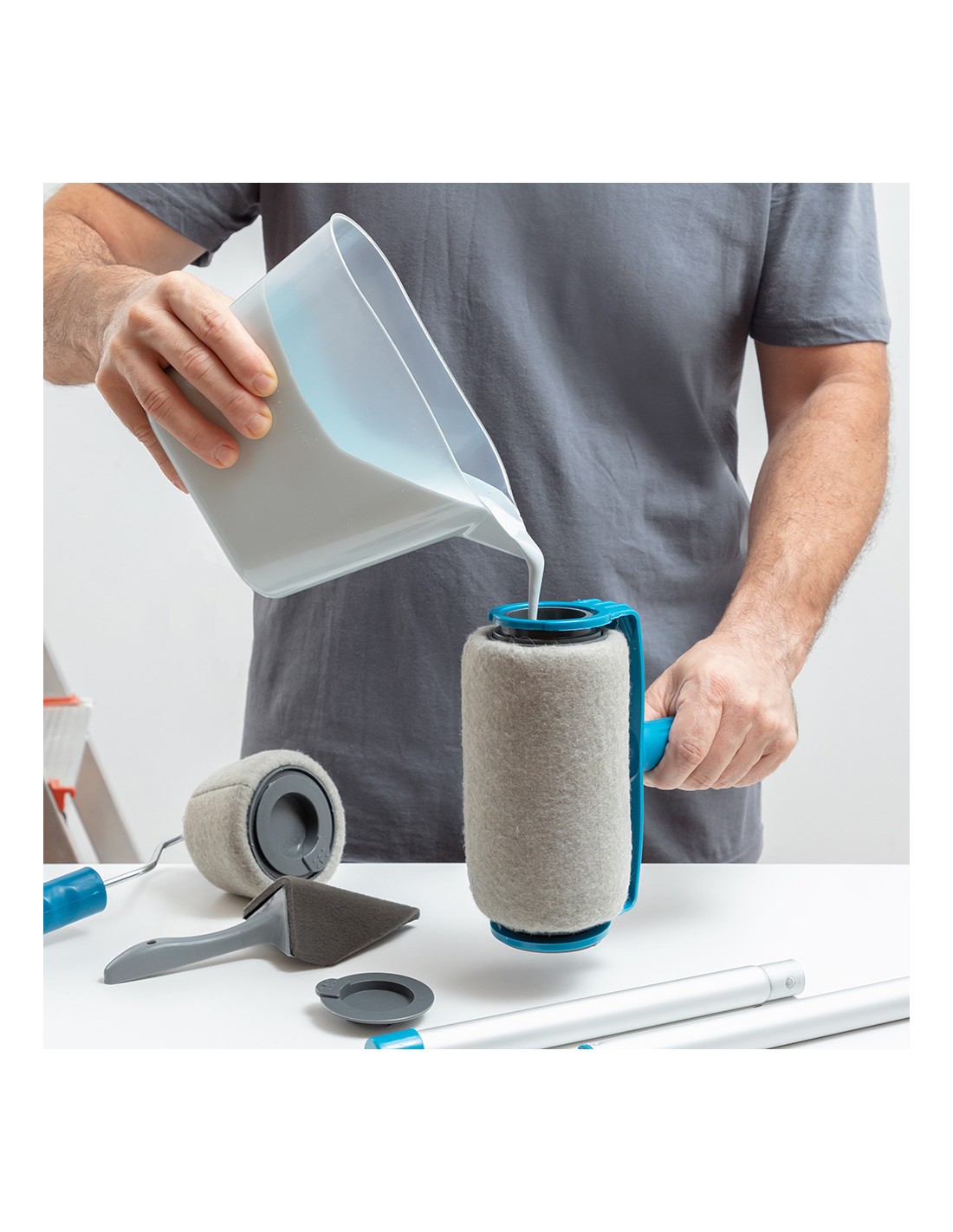 Set de rodillos de pintura recargables de pintura con gran capacidad de cobertura que minimizan el tiempo y esfuerzo que supone pintar y evitan derrames y goteos. fabricado en pp, poliéster y aluminio. pinta hasta 25 m aprox con cada carga de pintura. incluye: rodillo de pared con tapa de seguridad 16 x 9 cm, rodillo de precisión con tapa de seguridad 7 x 9 cm, cepillo para esquinas 8 x 20 cm, jarra de llenado de 1 l. y barra de extensión 75 cm