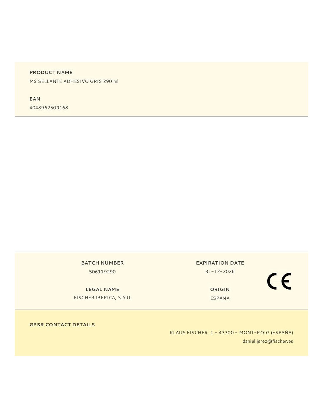 Ms sellante adhesivo gris fischer 290ml pega sella rellena elastico 700% 100kg/10cm aplicable en humedo intemperie