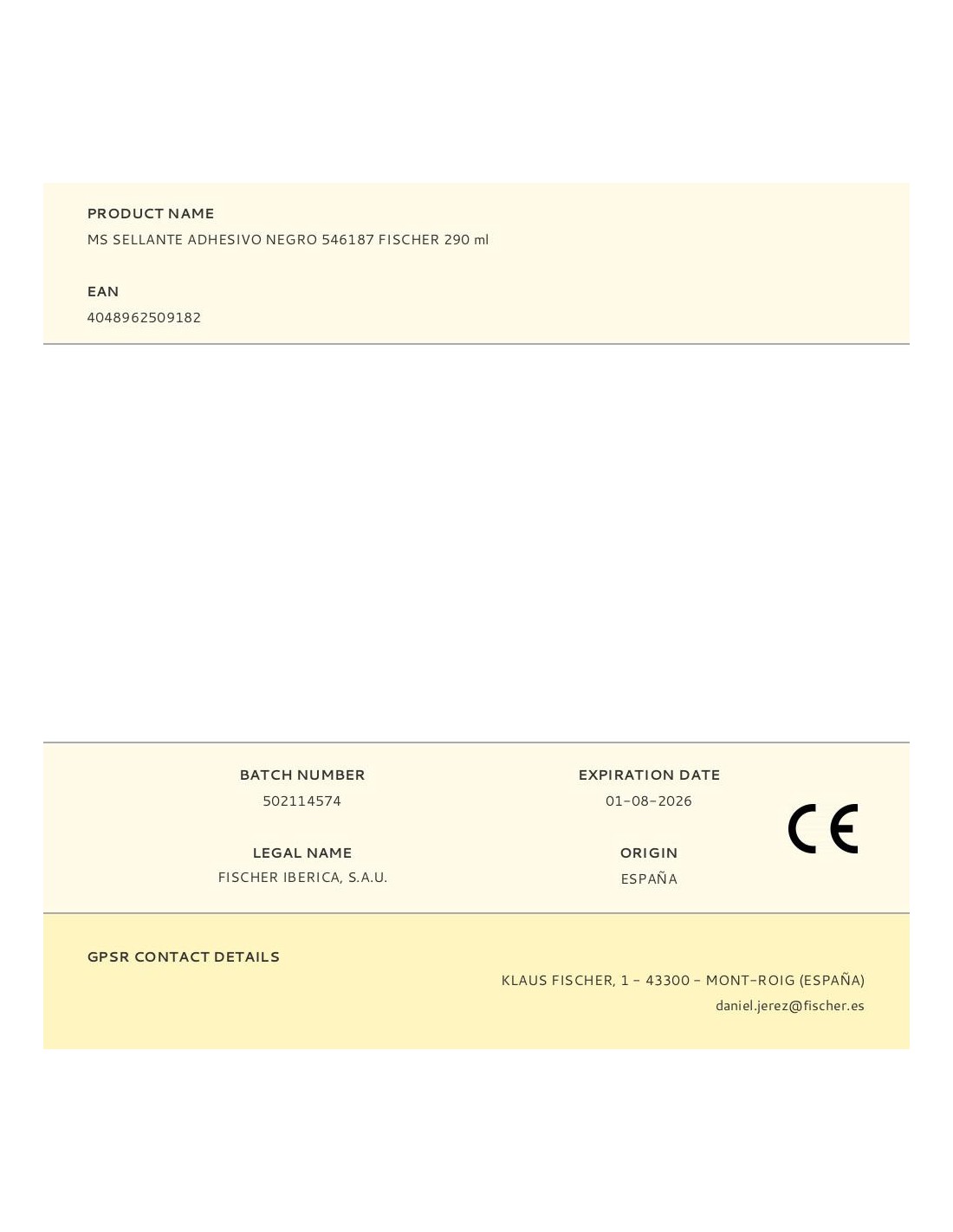 Ms sellante adhesivo negro fischer 290ml pega sella rellena elastico 700% 100kg/10cm aplicable en humedo intemperie