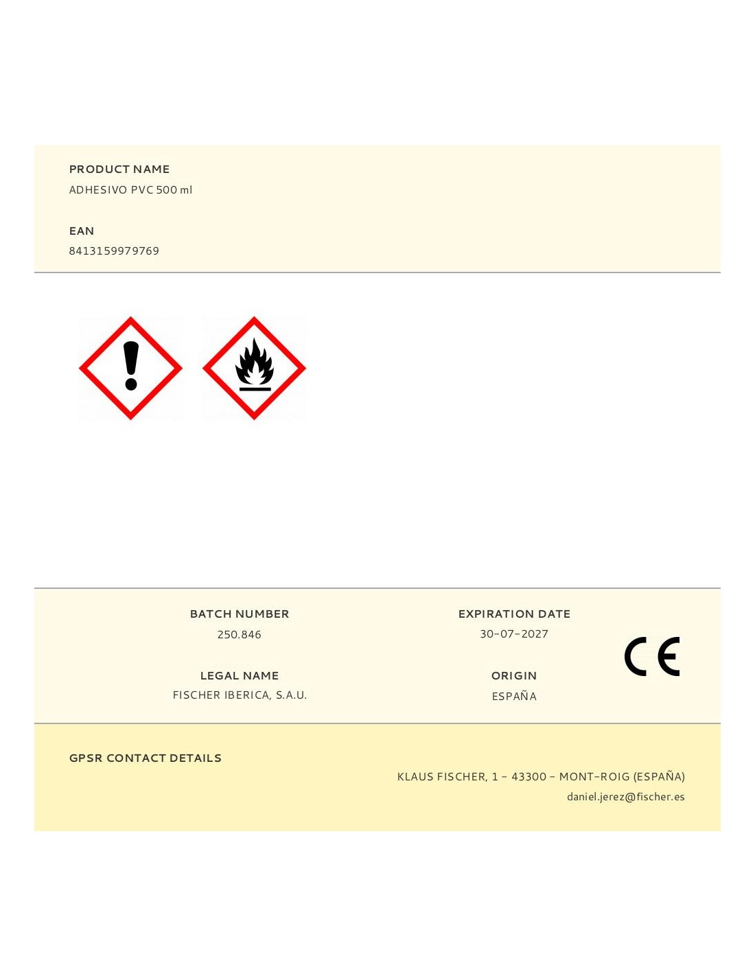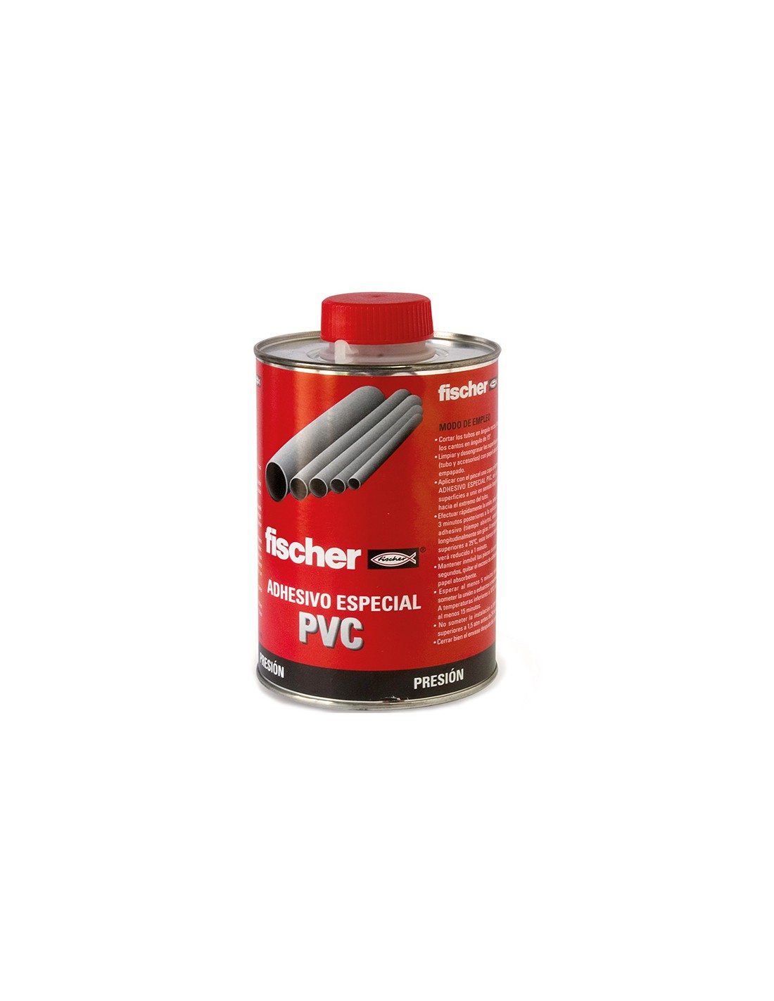 Adhesivo pvc 500ml fischer para materiales de pvc (caja 12 unid.). instalaciones profesionales. tuberías de pvc rígido para saneamiento. abastecimiento de aguas y otros líquidos. instalaciones de sistemas de riego. conducciones de evacuación. tuberías de pvc rígido para líquidos a presión. especialmente desarrollado para el pegado de tuberías y accesorios de pvc rígido. materia prima: polímeros vinílicos. incoloro/translúcido. para instalaciones profesionales. ensayo de presión: 40kg/cm según norma une 53-175.