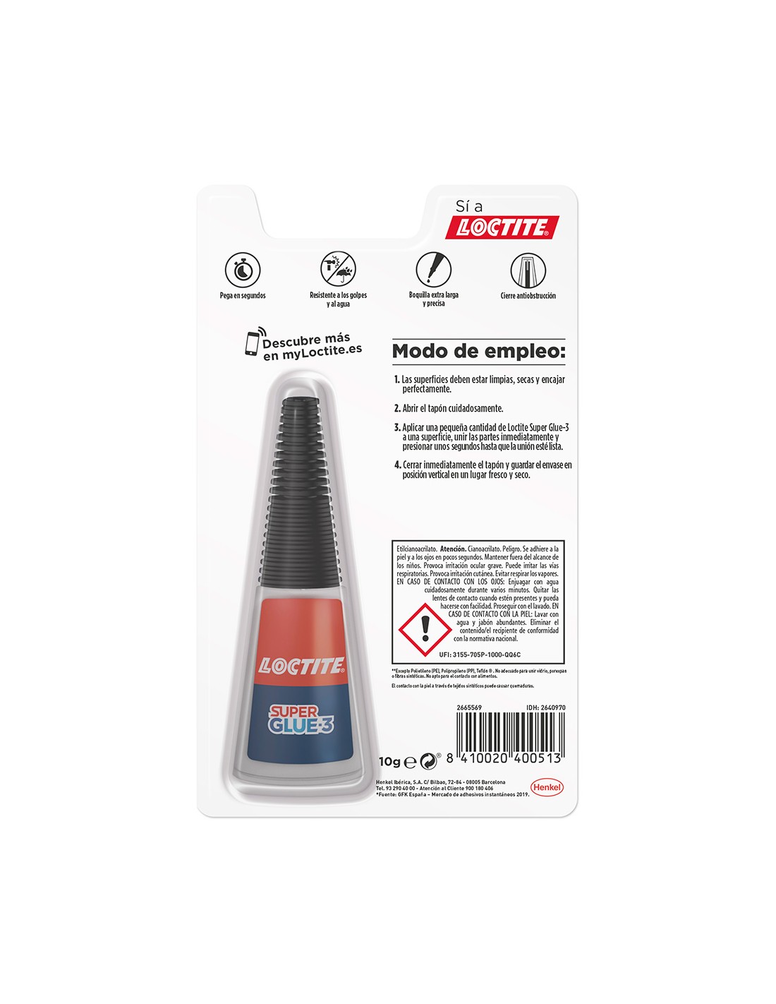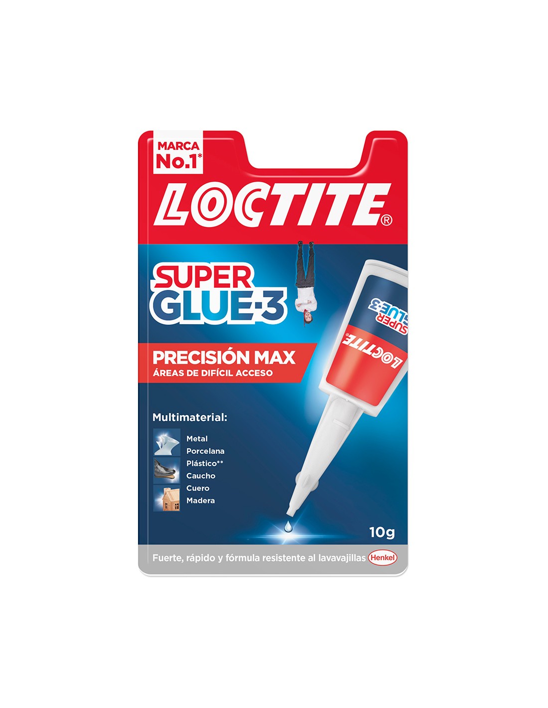 Super glue precision max 10 g. adhesivo universal instantaneo maxima fuerza union en pocos segundos triple resistencia: golpes, resistente al agua y resistente a las temperaturas extremas para pegar en pocos segundos todos los tipos de materiales: porcelana, madera, plastico, metal, goma, cuero, marmol, etc.