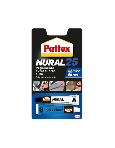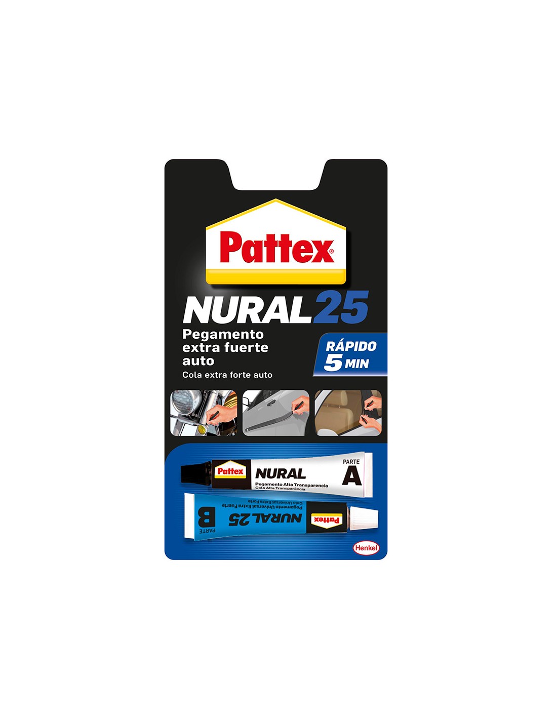 Pattex nural 25 22ml pegamento extra fuerte auto, translucido de gran resistencia, seca en 5 minutos, maxima rapidez formulado para pegar y reparar la mayoria de materiales del automovil. resiste las vibraciones del automovil. timpo de mezcla 2 minutos, tiempo de manipulacion 10 minutos, se adhire a chapa, todo tipo de metales, vidrio, fibra de vidrio, madera, goma, cuero, tejidos y plasticos.