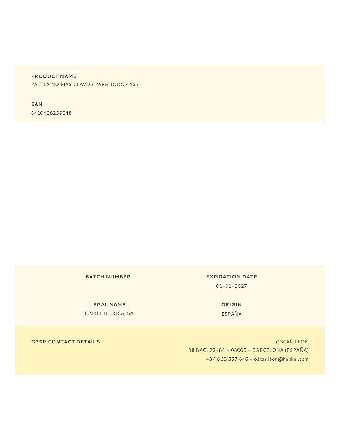 Pattex no mas clavos para todo 446g es un adhesivo libre de disolventes basado en la tecnologia flex tec de henkel, ideal para realizar trabajos de reparacion, bricolaje y montaje en general. ofrece un excelente agarre inicial y poder de pegado para todo tipo de aplicaciones, materiales y condiciones tanto en interior como en el exterior. se adhiere a todo tipo de superficies absorbentes y no absorbentes como maderas, ladrillo, metales, piedra, cerámica, azulejo, vidrio, yeso, escayola, hormigon, corcho, plastico, poliestireno extendido de alta densidad, porexpan, espejos, plasticos y pvc rigido