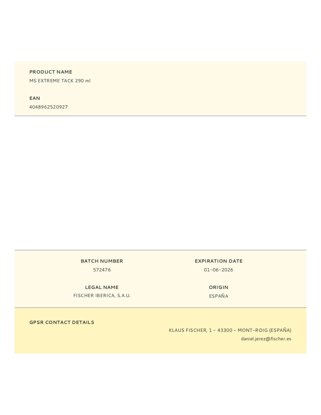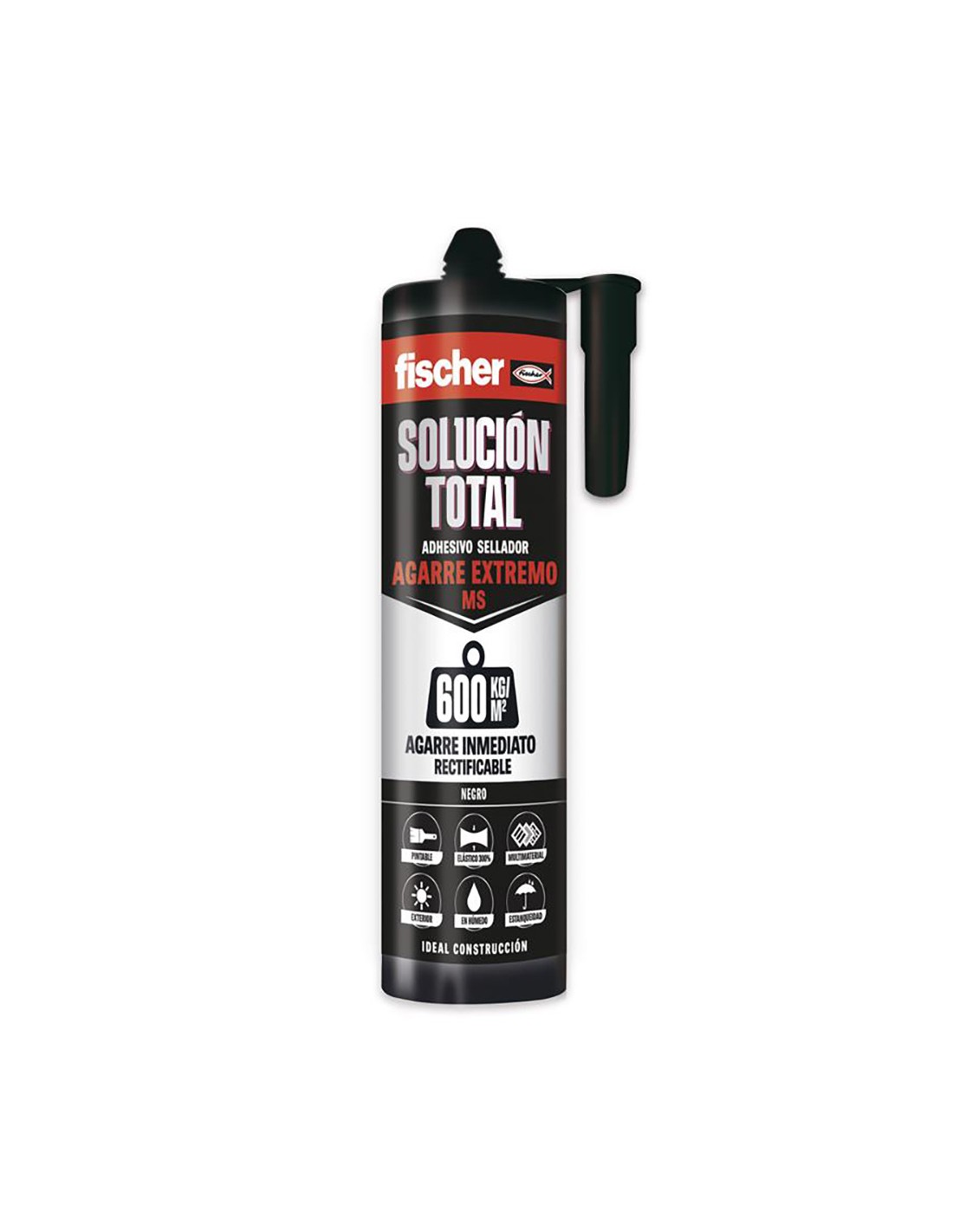 Ms extreme tack 290ml fischer. adhesivo monocomponente de curado rapido y elasticidad permanente basado en smp. adherencia inicial muy alta, adhesivo alta resistencia, curado por la humedad, reticulacion neutra y bajo olor. sin disolventes, isocianatos, ni siliconas. curado rapido y completo. elasticidad permanente de -40°c a +90°c. resistencia mecanica muy alta. inodoro. compatible con pinturas. no es corrosivo en las superficies. resistente a los golpes y vibraciones (amortiguador). resistente a la expansion termica y la tension del material.