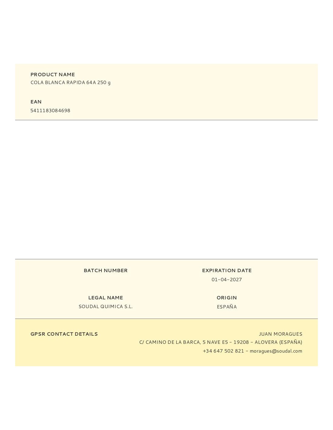 Cola blanca rapida 64a 250 g. pegado de todo tipo de ensamblajes de madera porosas (madera, papel, mdf...) secado rapido (20 minutos) y alta potencia adhesiva