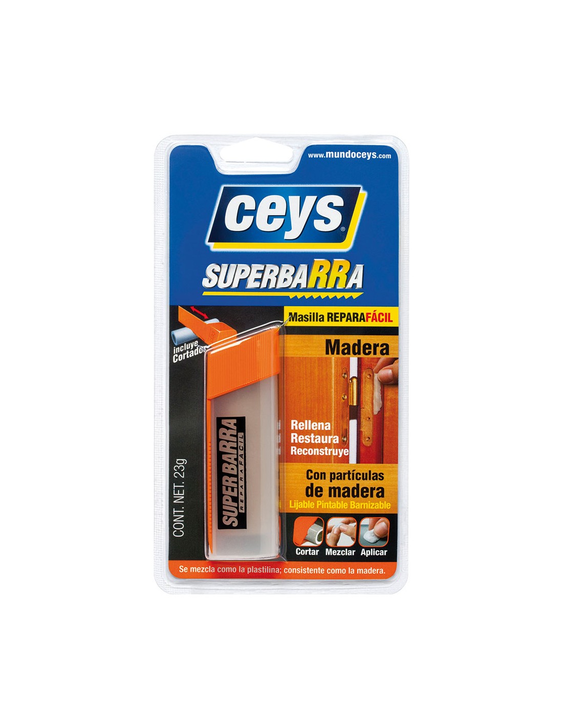 Ceys super barra reparadora madera 23g. masillas moldeables de 2 componentes, presentadas en una barra, que reaccionan al mezclarse. indicadas para reparar, reconstruir, rellenar, fijar y sellar todo tipo de materiales de forma definitiva. fácil aplicación: se mezcla como la plastilina, endurecen como el acero en pocos minutos. endurecen bajo el agua. se pueden lijar, taladrar, pulir y pintar. una vez endurecidos, presentan las mismas propiedades que el material que reparan.