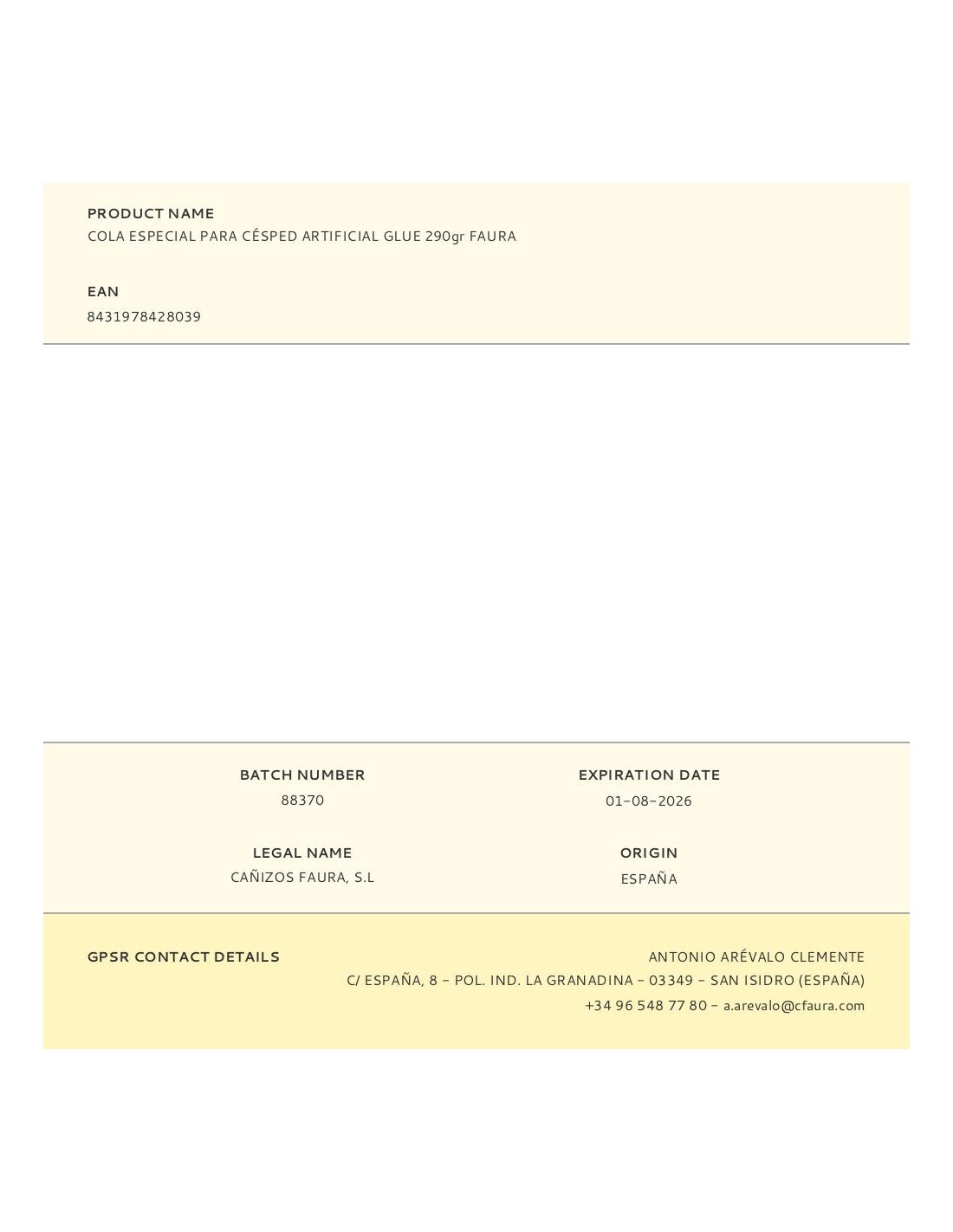 Cola especial para césped artificial glue 290gr faura. aplicación con pistola, color verde. adhesivo especial para césped artificial. muy buena adhesión y secado ultra rápido. apta para superficies húmedas. gran resistencia a los rayos uv y a la intemperie. aplicable tanto en interior como en exterior. totalmente exento de isocianatos, siliconas y disolventes. apto para la adhesión sobre la gran mayoría de materiales de construcción: hormigón, ladrillo, cerámica. sin olores molestos. no requiere uso de guantes.