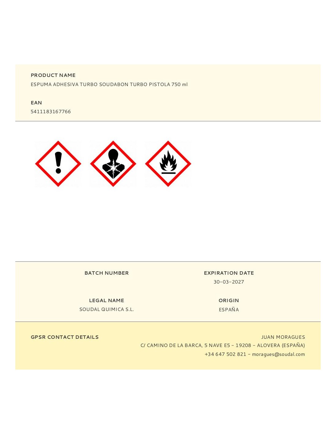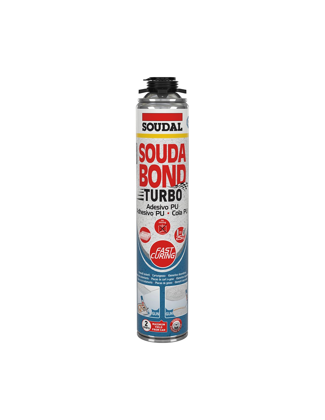 Espuma adhesiva turbo soudabon turbo pistola 750 ml. es una espuma adhesiva de poliuretano monocomponente, limpio, eficiente y económica de paneles aislantes con otros materiales de construcción en la edificación y la construcción