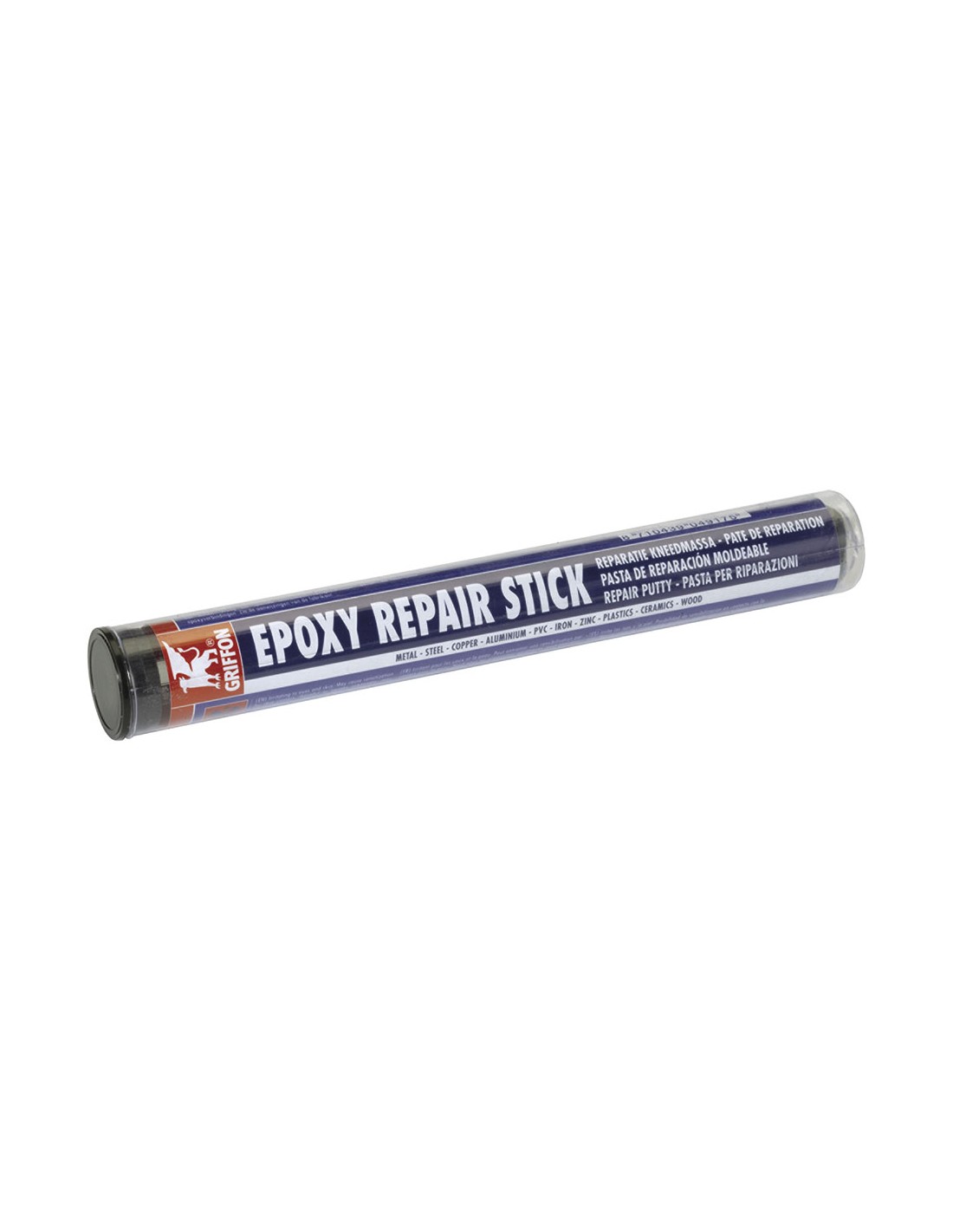 Griffon epoxy repair stick barra 114g ref. 6152402. masilla epoxi moldeable de 2 componentes para reparaciones y restauraciones permanentes de casi todos los materiales. apta para reparar y sellar fugas, picaduras y grietas en tuberías, radiadores, calentadores de agua, desagües, canales de ventilación, canalones y tanques de almacenamiento. se adhiere a acero, cobre, aluminio, hierro, cinc, pvc, madera, materiales sintéticos, cerámica, azulejos, barro y hormigón.