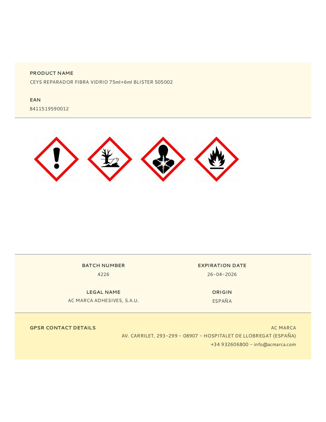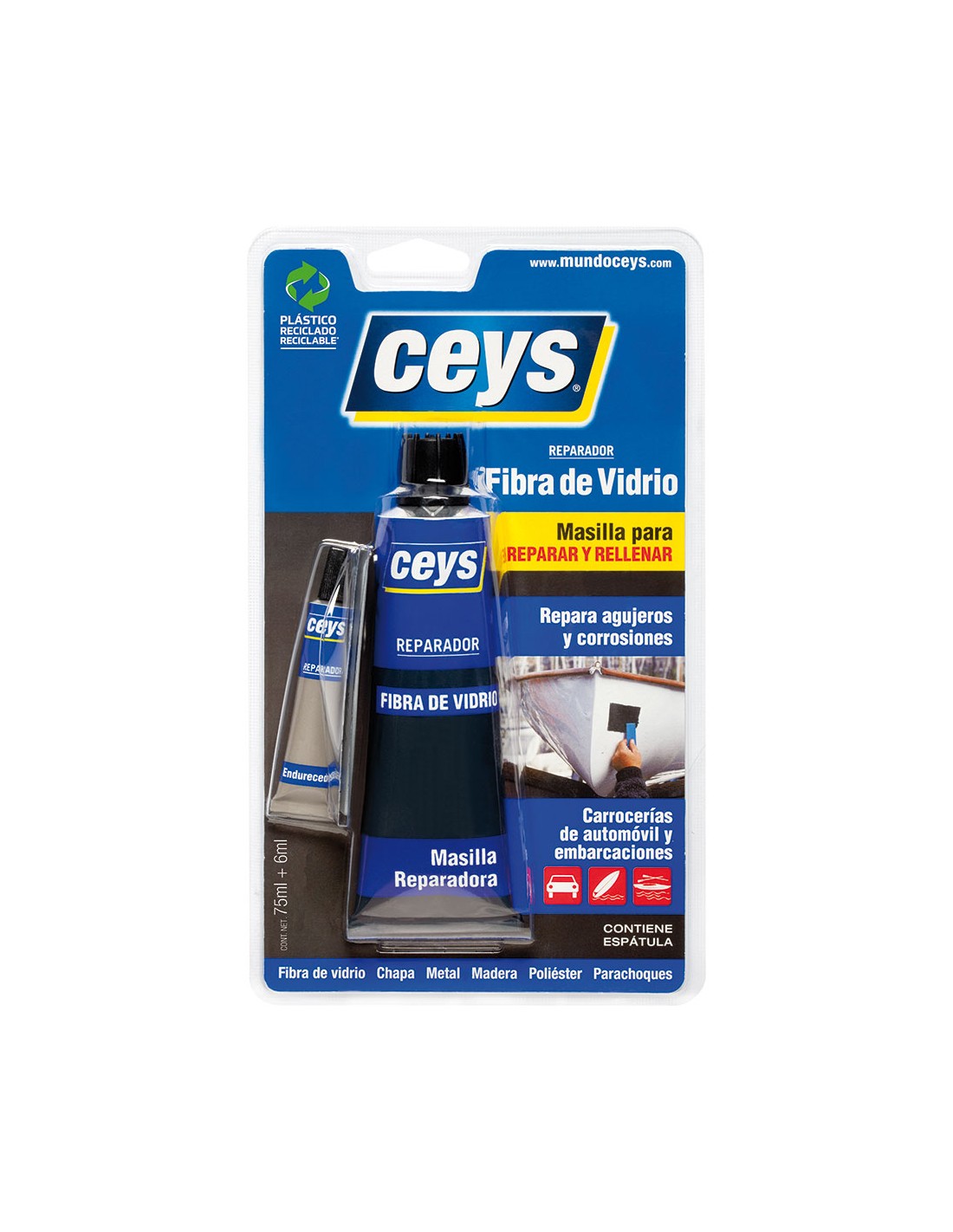 Ceys reparador fibra vidrio 75ml+6ml blister 505002. masilla bicomponente indicada para reparar pequeñas abolladuras y golpes en la plancha de automóviles y motocicletas. consigue acabados rápidos y perfectos, listos para su posterior manipulación: lijado y pintado.