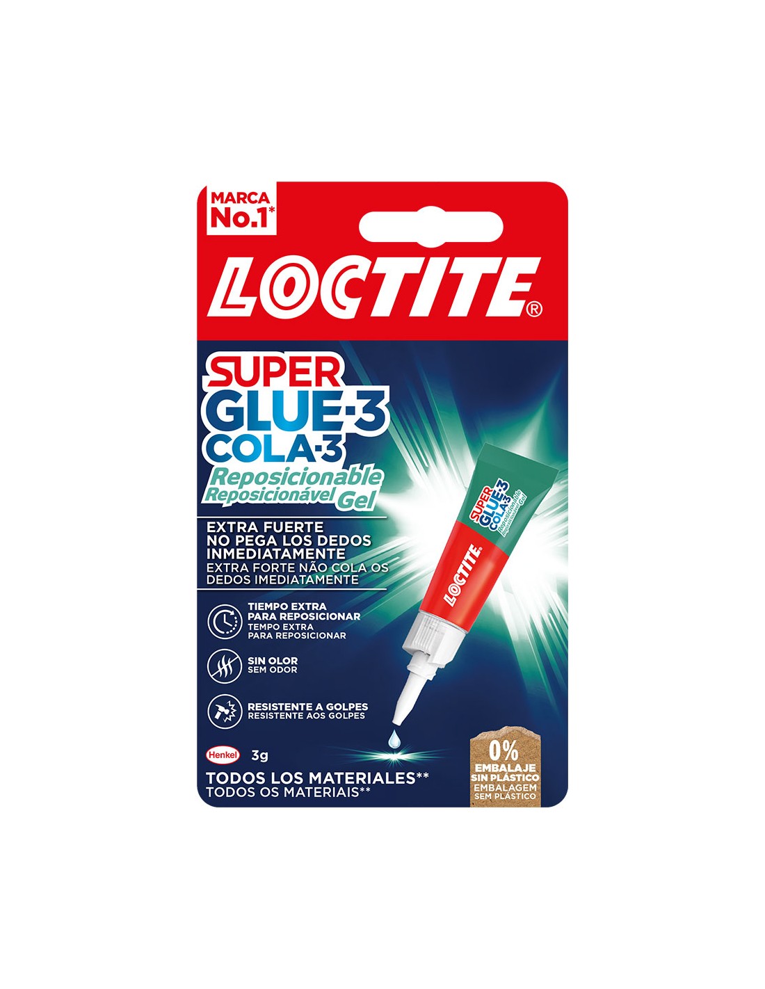 Superglue-3 gel reposicionable 3 g. adhesivo universal instantáneo. máxima fuerza de unión. dedos libres, no se pegan inmediatamente.gel adhesivo instantáneo y extrafuerte que se adapta a los . materiales flexibles gracias a su fórmula de cianoacrilato enriquecida con partículas de caucho. el producto está diseñado para su utilización en el hogar