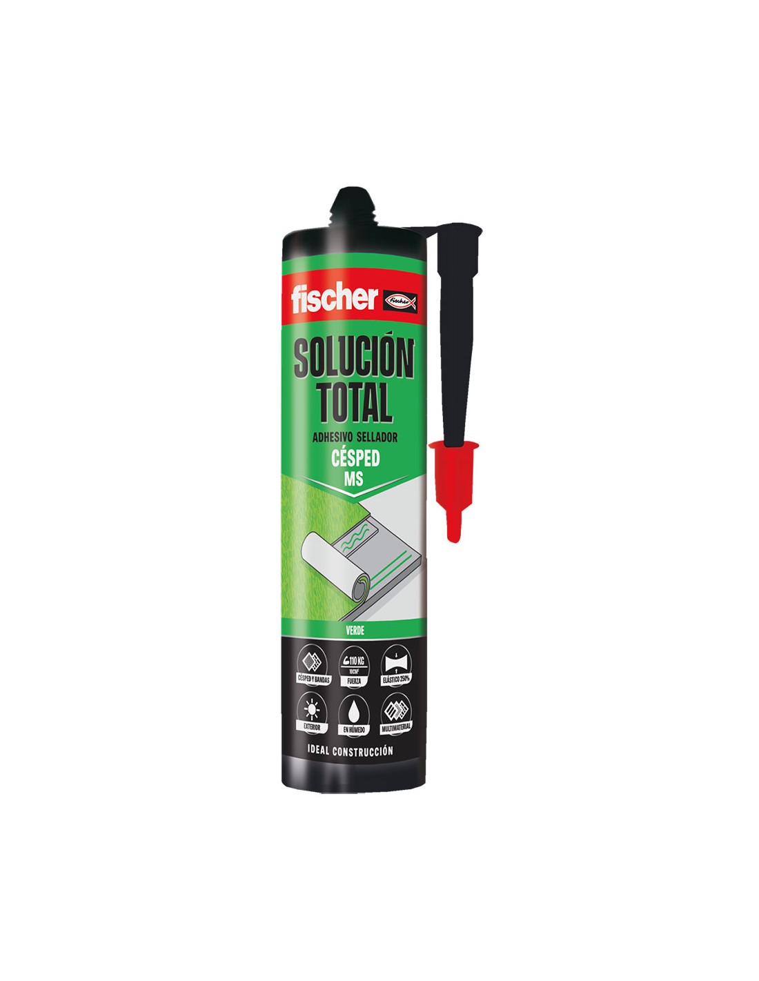 Solución total cesped 290ml 572480 fischer,color verde, adhesivo sellador, elastico 250%, agarre con una fuerza de traccón de 110 kg/10cm, multimaterial, específico para cesped y bandas, seca en húmedo, tanto para exterior como para interior, a la vez que pega estanqueiza.