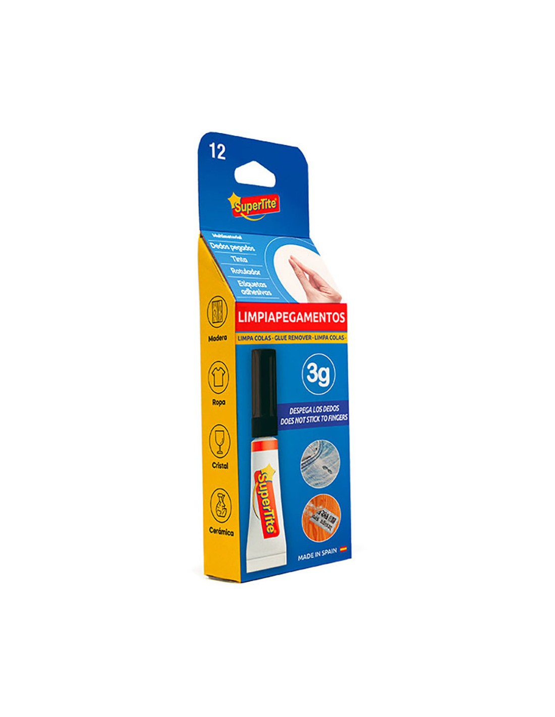 Limpiador adhesivos blister 3 g disolvente en forma de gel especialmente indicado para: eliminar las manchas de los adhesivos sobre ropas y tejidos, objetos mal ensamblados, dedos pegados, superficies de trabajo manchadas, etc. y de forma particular eliminar los chicles pegados. resolver la mayoría de problemas relacionados con los derrames accidentales y usos indebidos de todo tipo de pegamentos. limpiar la cánula de aplicación o boca del envase de cianoacrilato que pudiera haber quedado obstruido