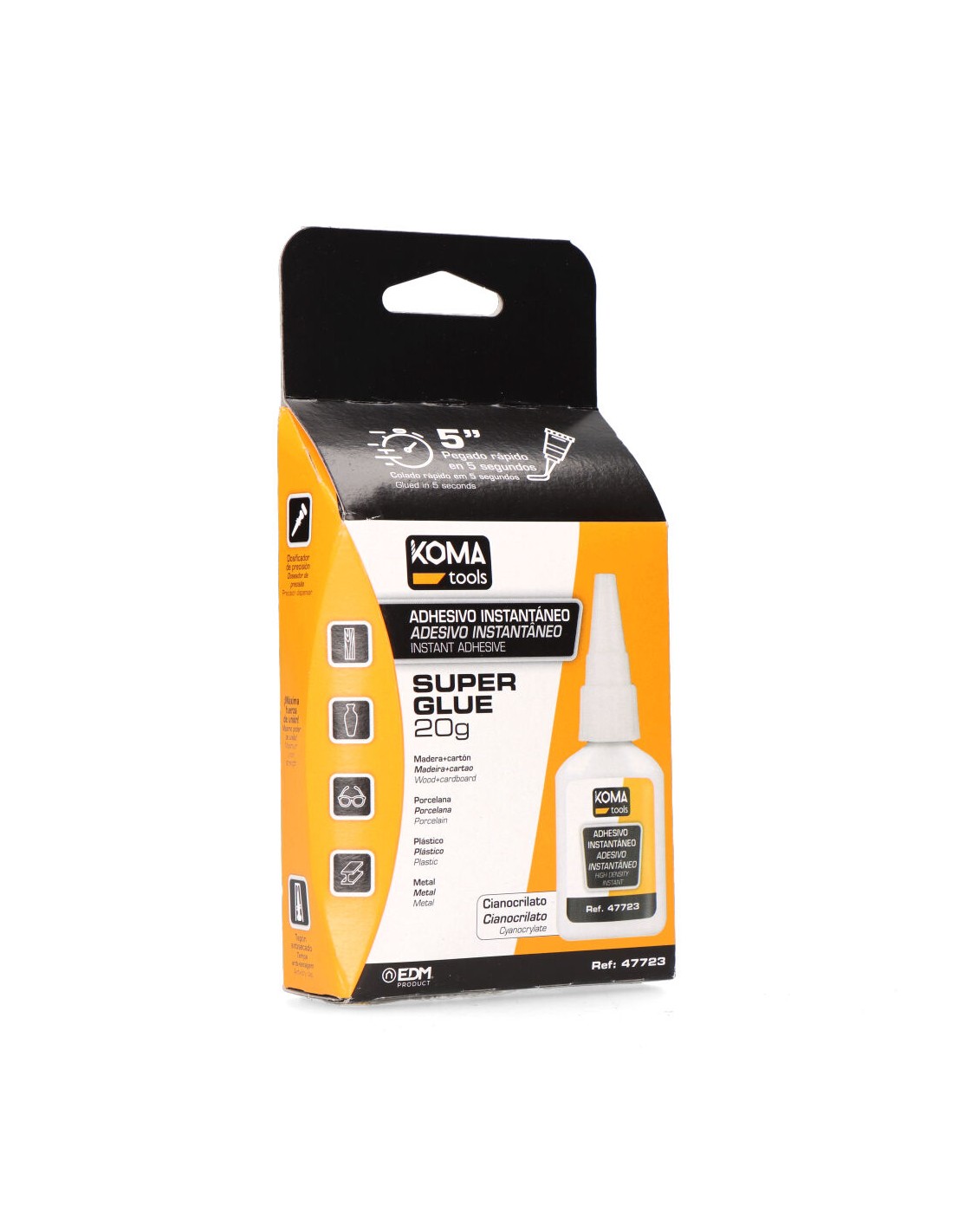 Adhesivo instantaneo pegado rapido, 5 segundos, multisuperficies, resistente al agua no adecuado para polietileno (pe), polipropileno (pp), politetrafluoretileno (ptfe) empleo en bricolaje y en industria en general. presentación en bote de 20 g, con dosificador de precisión y tapón antisecado