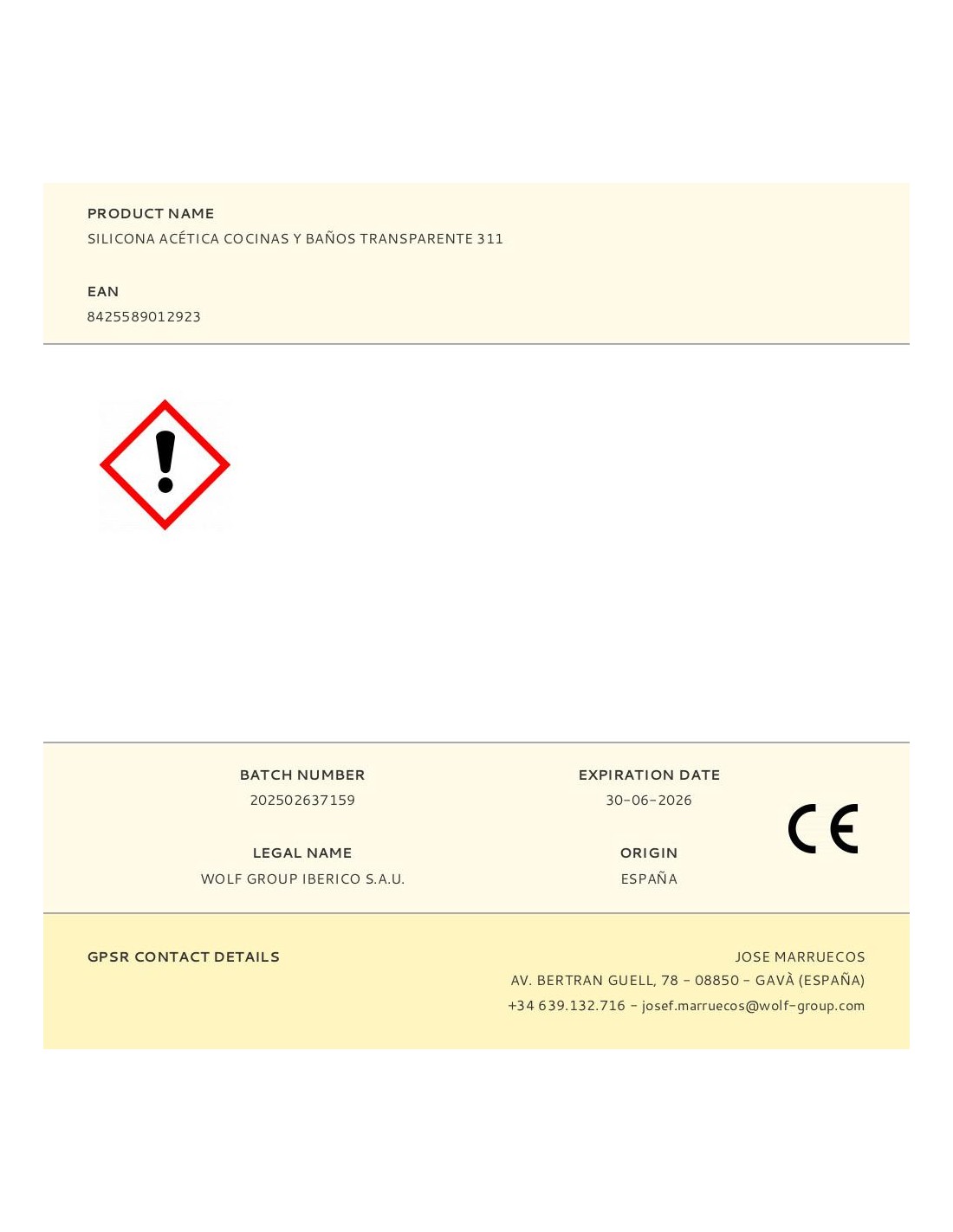 Silicona acética para cocinas y baños 311 transparente, antimoho y elástica. protección fungicida. gran resistencia a la radiación uva, cambios de temperartura y al envejecimiento. curado rápido 30 min