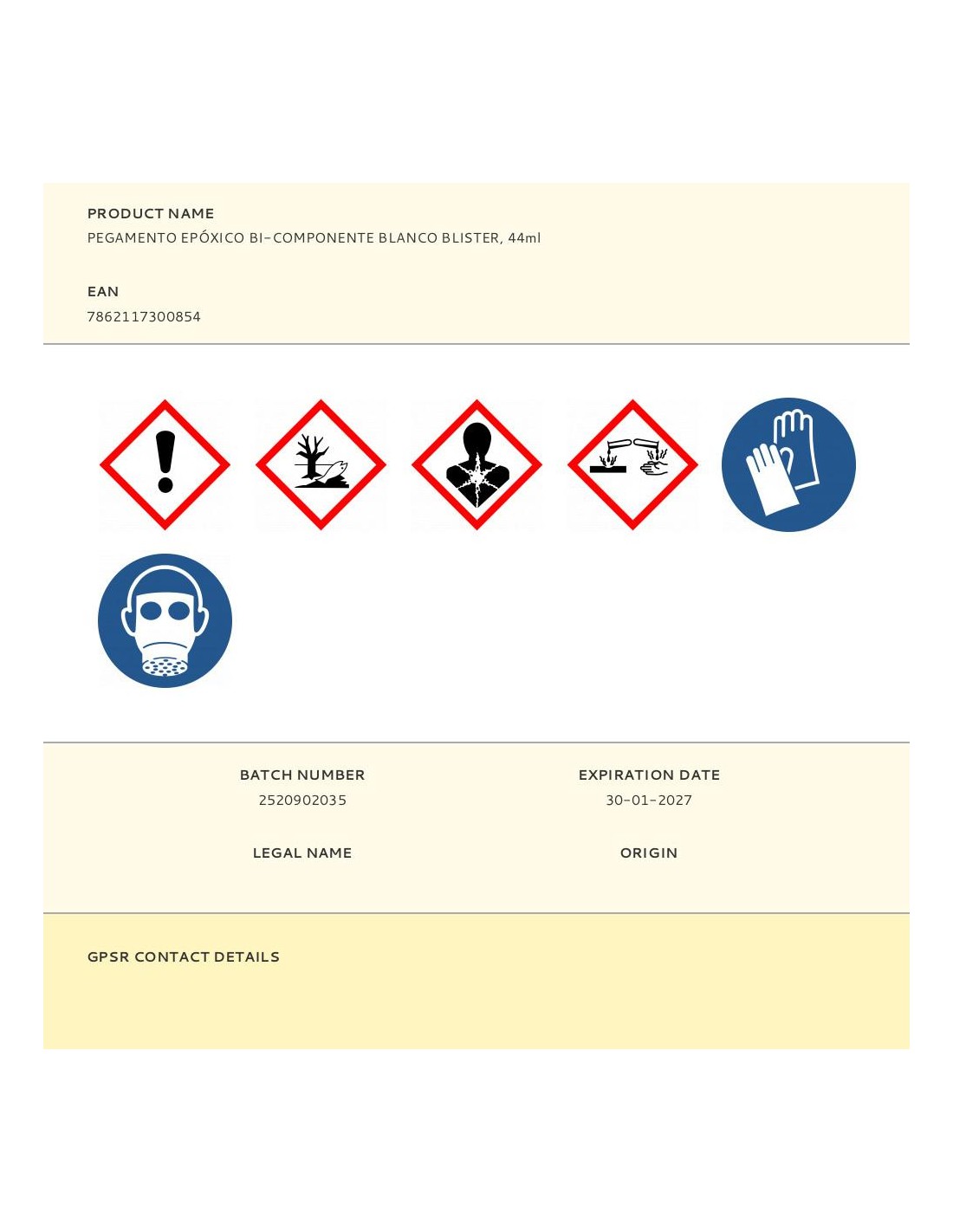 Pegamento epóxico profesional bi-componente blanco, reparaciones exigentes y soldadura en frío seca en 30 min al sol único aplicable y cura bajo el agua aplicable en cualquier superficie de vidrio, plástico, cerámica, fibra de vidrio, losa, metal, aluminio, cobre, madera, mdf y otras. soporta hasta 200 kg peso muerto y 250°c. mecanizable. idoneo en reparaciones automotrices, navales, eléctricas, aeroespaciales, militares, brico y construcción excelente soporte mecánico a la abrasión y resistencia química excepcional contra solventes