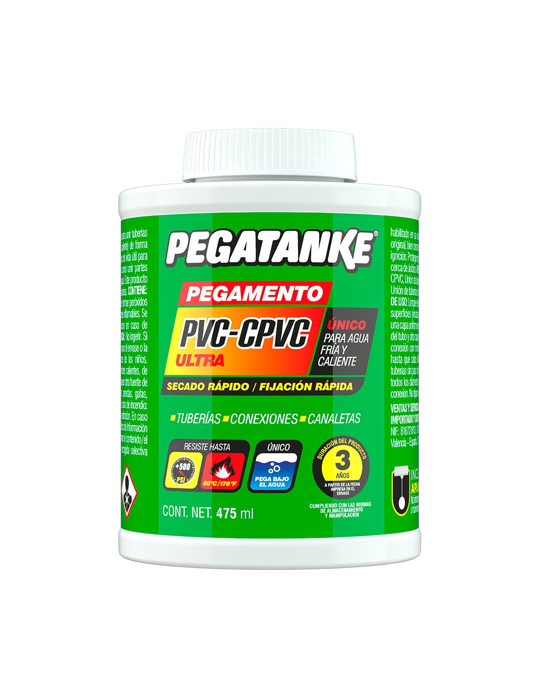 Pegamento para unión de tuberías o canaletas de pvc (agua fría) - cpvc (agua caliente), con aplicador dentro de la lata, alta resistencia, presenta una resistencia a +500 psi y 80°c puede ser aplicada en seco, bajo el agua o en superficies húmedas el curado completo se logra en aproximadamente 1 h, 475 ml