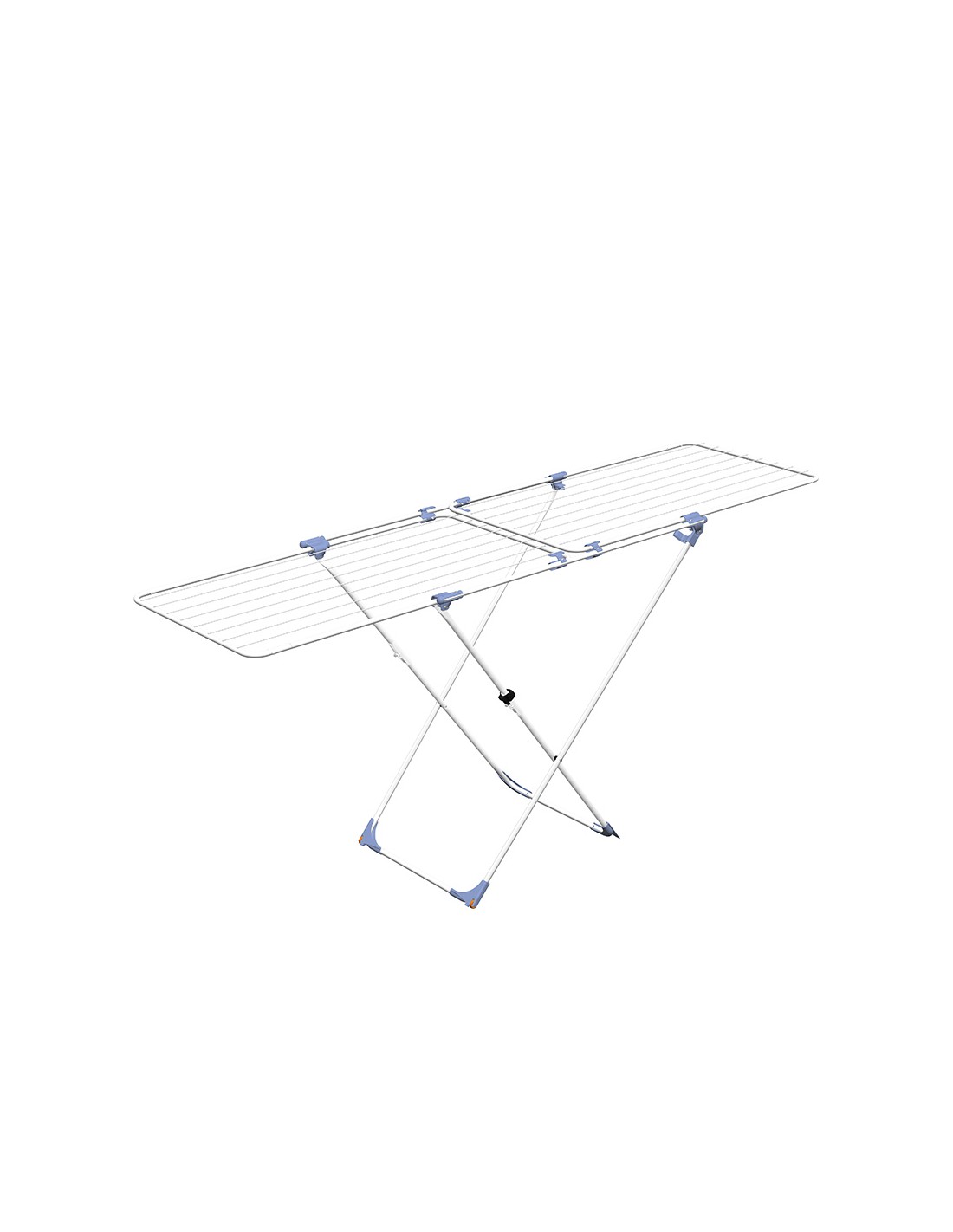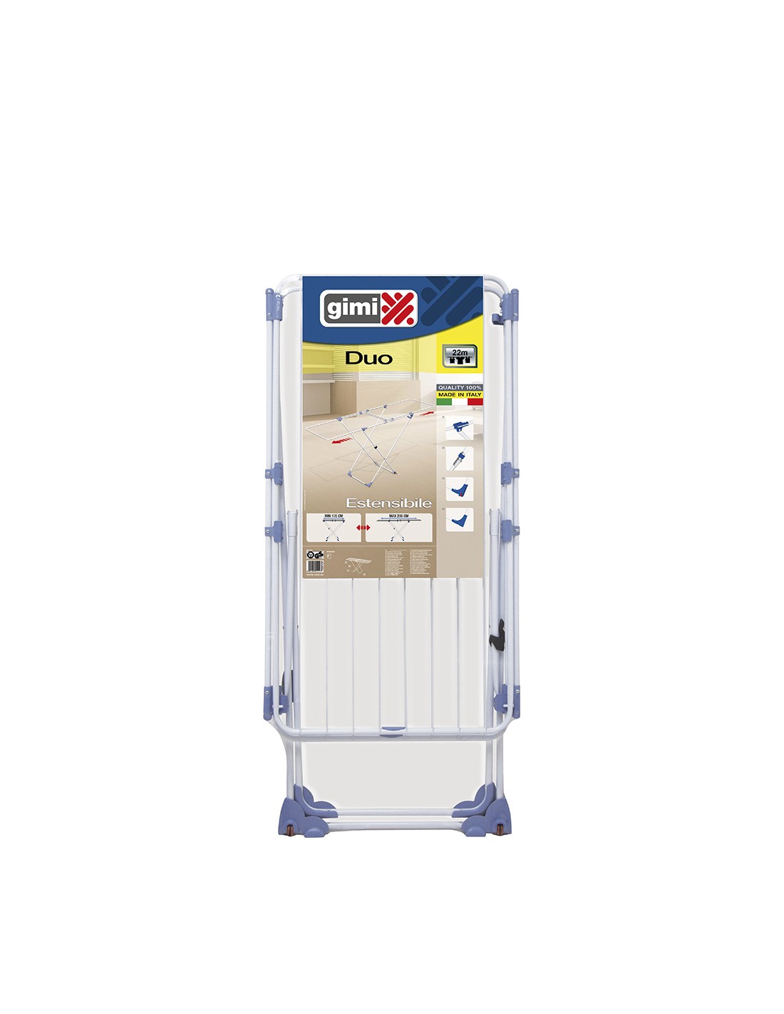 Tendedero extensible duo de acero. dos rejillas superpuestas y correderas. seguro anticierre accidental, ruedas y perfiles angulares. espacio de tendido 22 m. dimensiones min/max 105 -209 x 60 x 97 cm
